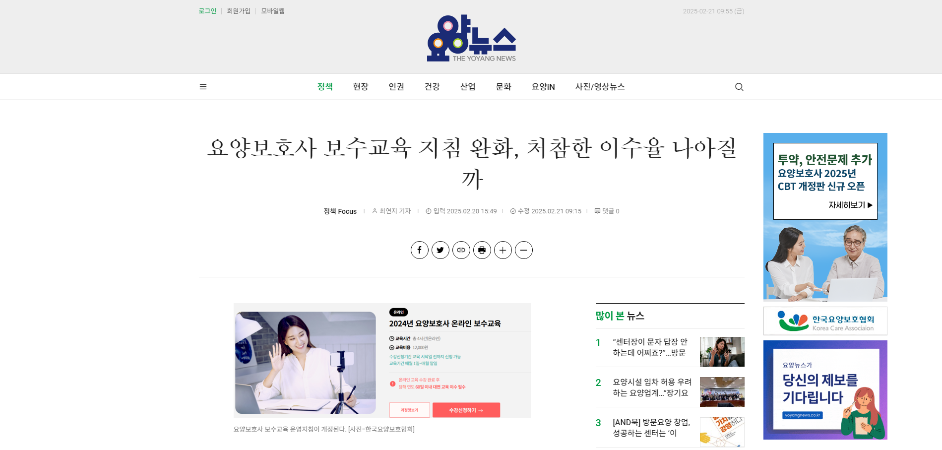 20일 국민건강보험공단은 ‘요양보호사 보수교육 운영지침 개정 안내’를 발표했다. 공단은 개정 사유로 ‘요양보호사 보수교육 이수율’ 제고를 짚었다.