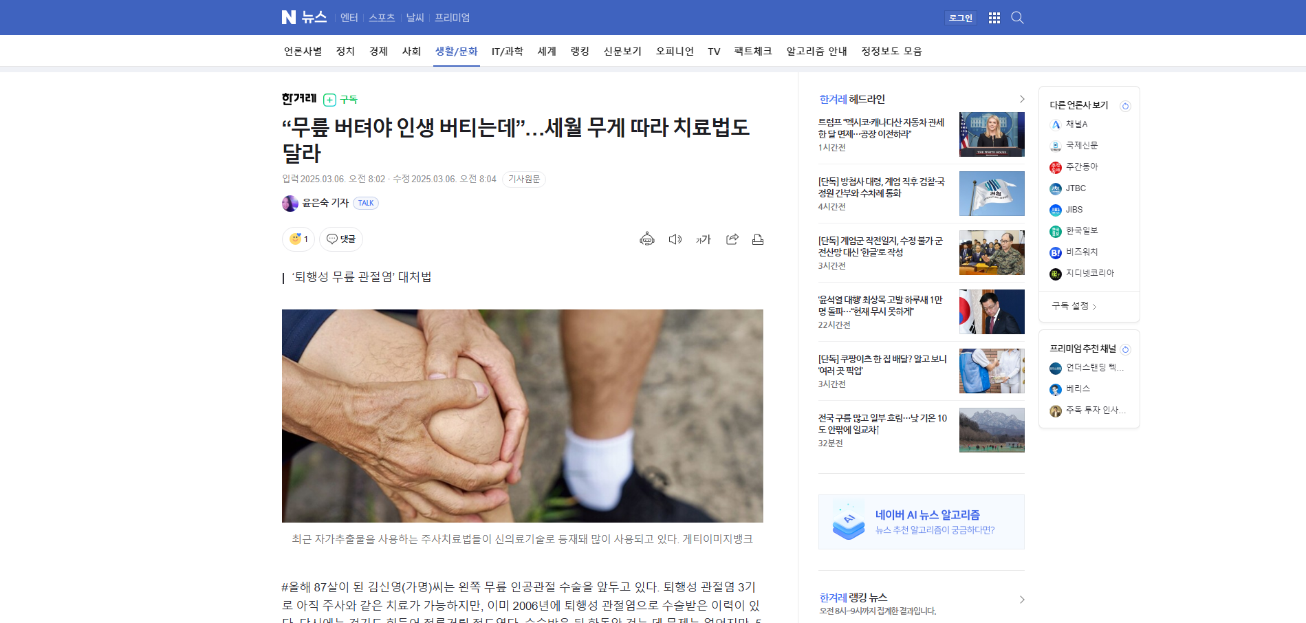 김씨는 “한의원도 가고 주사도 맞아봤지만 효과가 오래 안 갔다. 위가 약한 편이라 약을 많이 먹는 것도 부담돼 수술하기로 결정했다. 무릎이 괜찮아야 운동도 할 수 있고, 자식들 짐이 되지 않을 것 같다. 최근에 나이가 많이 들어서 수술하는 경우도 많다고 들어 수술을 결심했다”고 말했다.