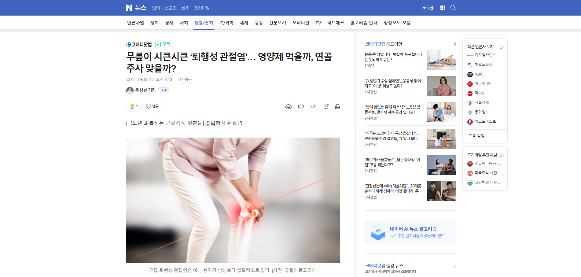 무릎이 시큰시큰 ‘퇴행성 관절염’… 영양제 먹을까, 연골주사 맞을까?