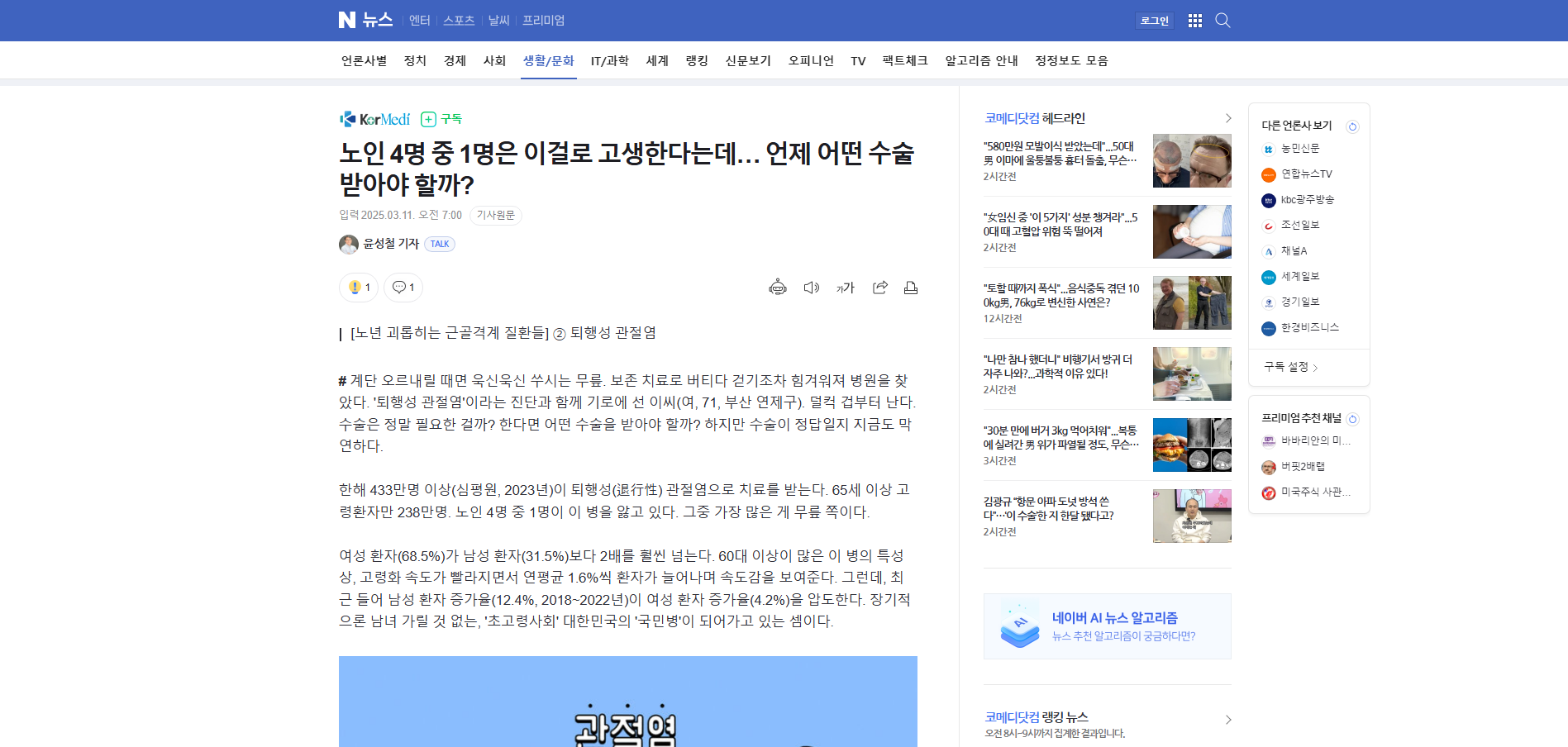 ![1년에 430만명 넘는 이가 퇴행성 관절염으로 병원을 찾는다. 초고령사회 한국의 국민병이 되어가고 있다. [사진=클립아트코리아]](https://imgnews.pstatic.net/image/296/2025/03/11/0000087477_001_20250311070007802.jpg?type=w860)