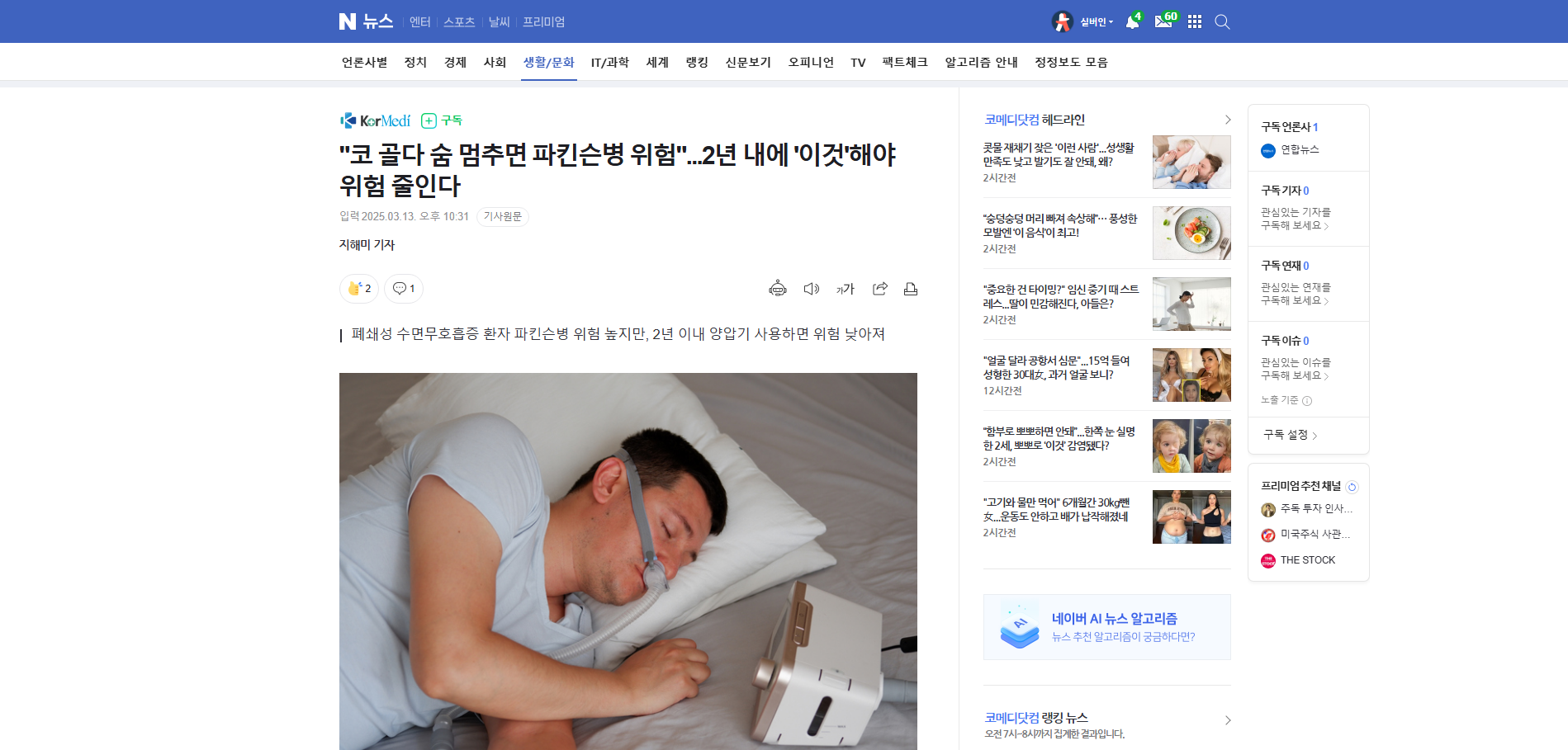"코 골다 숨 멈추면 파킨슨병 위험"...2년 내에 '이것'해야 위험 줄인다