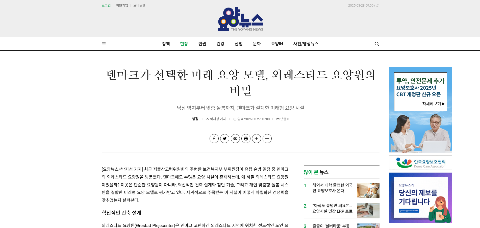 [요양뉴스=박지성 기자] 최근 저출산고령위원회의 주형환 보건복지부 부위원장이 유럽 순방 일정 중 덴마크의 외레스타드 요양원을 방문했다. 덴마크에도 수많은 요양 시설이 존재하는데, 왜 하필 외레스타드 요양원이었을까? 이곳은 단순한 요양원이 아니라, 혁신적인 건축 설계와 첨단 기술, 그리고 개인 맞춤형 돌봄 시스템을 결합한 미래형 요양 모델로 평가받고 있다. 세계적으로 주목받는 이 시설이 어떻게 차별화된 경쟁력을 갖추었는지 살펴본다.