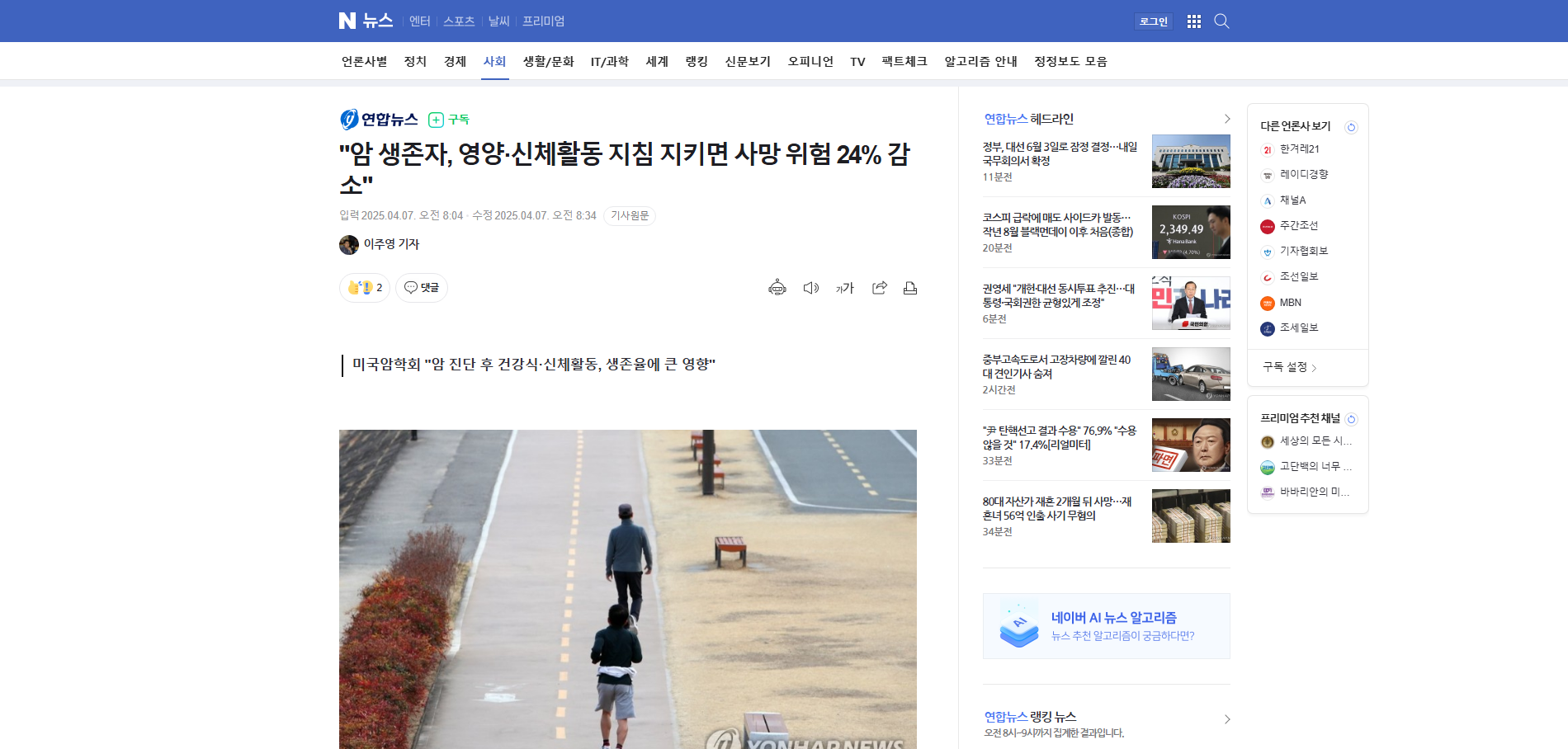 또 BMI와 신체활동 점수가 높을수록 모든 원인에 의한 사망률이 낮았고, 암 진단 전후 가이드라인 점수가 5점 미만을 유지한 생존자에 비해 지속해 5점 이상을 유지한 생존자는 모든 원인 및 심혈관 질환 사망 위험이 낮았다.