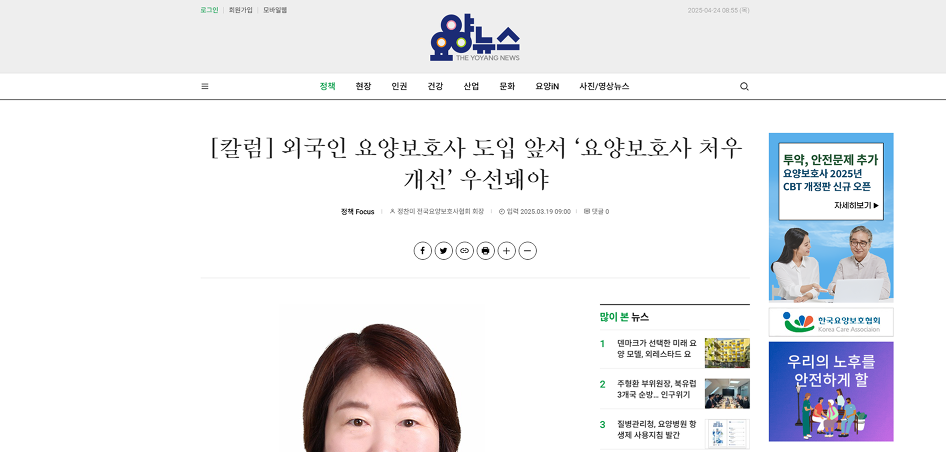 [요양뉴스=정찬미 전국요양보호사협회 회장] 최근 정부가 외국인 요양보호사 양성을 확대하는 방안을 발표하면서 요양보호사 인력 부족 문제에 대한 논의가 활발해지고 있다. 그러나 이러한 외국 인력 확대 정책이 근본적인 해결책이 될 수 있을지는 의문이다.