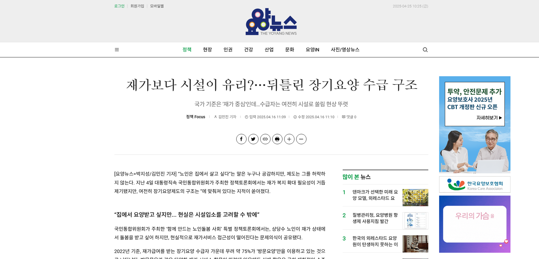 전문가들은 “재가 서비스를 활성화하려면 단순히 예산을 늘리는 데 그칠 게 아니라, 급여 한도 현실화, 지역 간 서비스 편차 해소, 수급자 중심의 맞춤형 설계 등이 함께 이뤄져야 한다”고 강조했다.