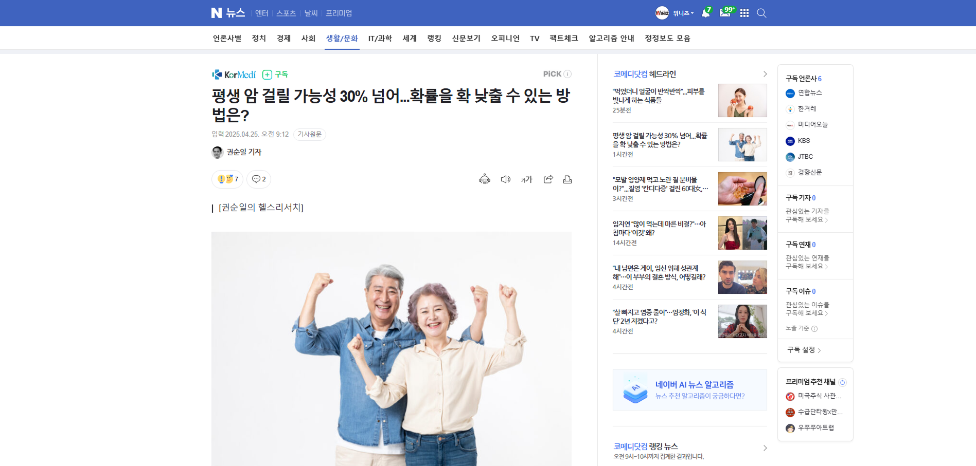 ![담배를 멀리하고, 신체 활동을 활발하게 하는 등 건강 생활 습관을 몇 가지만 잘 실천해도 암에 걸릴 확률을 크게 낮출 수 있다. [사진=클립아트코리아]](https://imgnews.pstatic.net/image/296/2025/04/25/0000088954_001_20250425091209509.jpg?type=w860)