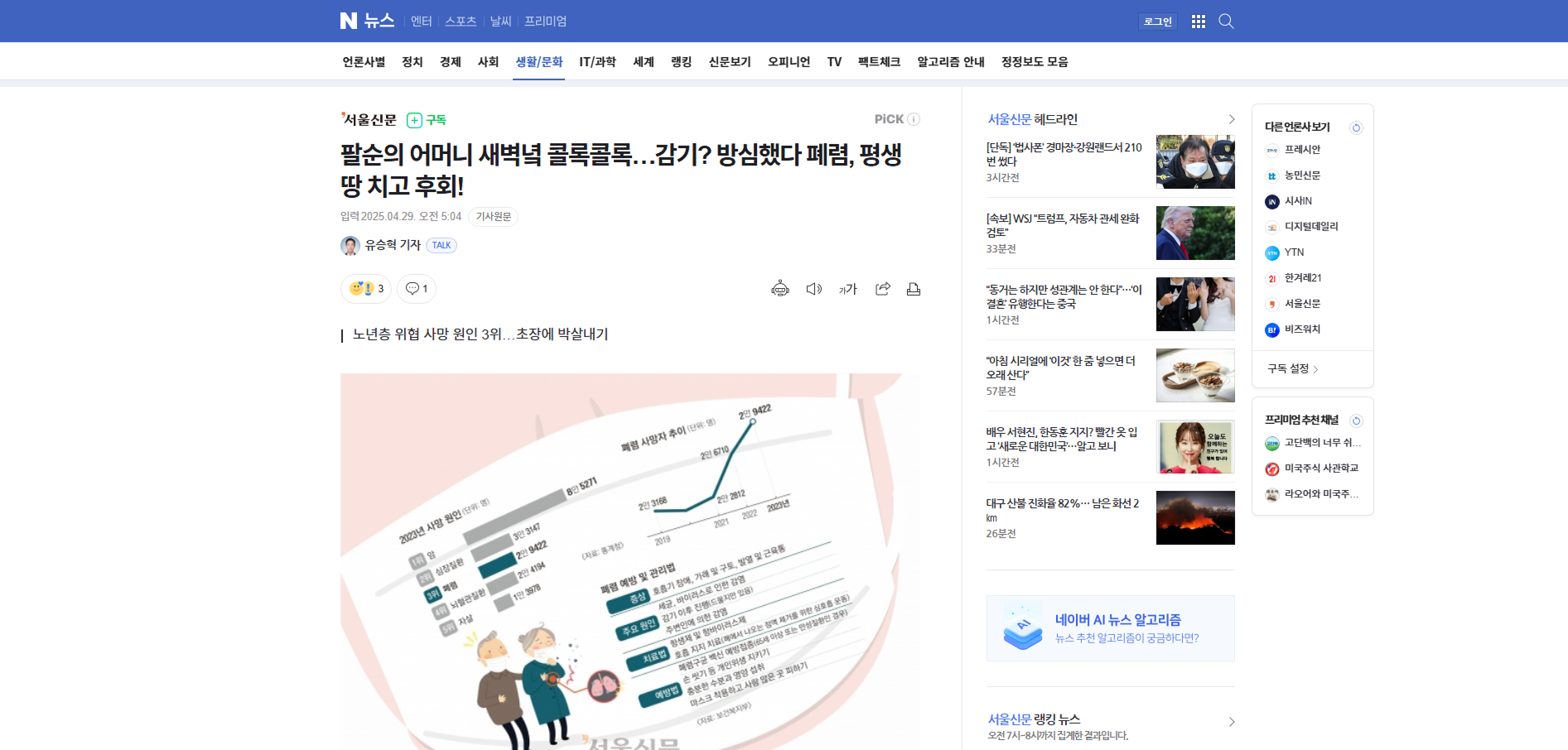 팔순의 어머니 새벽녘 콜록콜록…감기? 방심했다 폐렴, 평생 땅 치고 후회!
