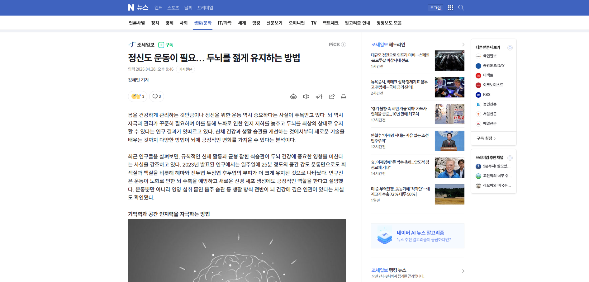 최근 연구들을 살펴보면, 규칙적인 신체 활동과 균형 잡힌 식습관이 두뇌 건강에 중요한 영향을 미친다는 사실을 강조하고 있다. 2023년 발표된 연구에서는 일주일에 25분 정도의 중간 강도 운동만으로도 회색질과 백질을 비롯해 해마와 전두엽 두정엽 후두엽의 부피가 더 크게 유지된 것으로 나타났다. 연구진은 운동이 노화로 인한 뇌 수축을 예방하고 새로운 신경 세포 생성에도 긍정적인 역할을 한다고 설명했다. 운동뿐만 아니라 영양 섭취 흡연 음주 습관 등 생활 방식 전반이 뇌 건강에 깊은 연관이 있다는 사실도 확인됐다.