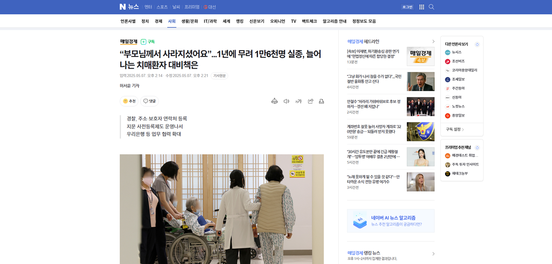 - 이전글“부모님께서 사라지셨어요”...1년에 무려 1만6천명 실종, 늘어나는 치매환자 대비책은 25.05.07