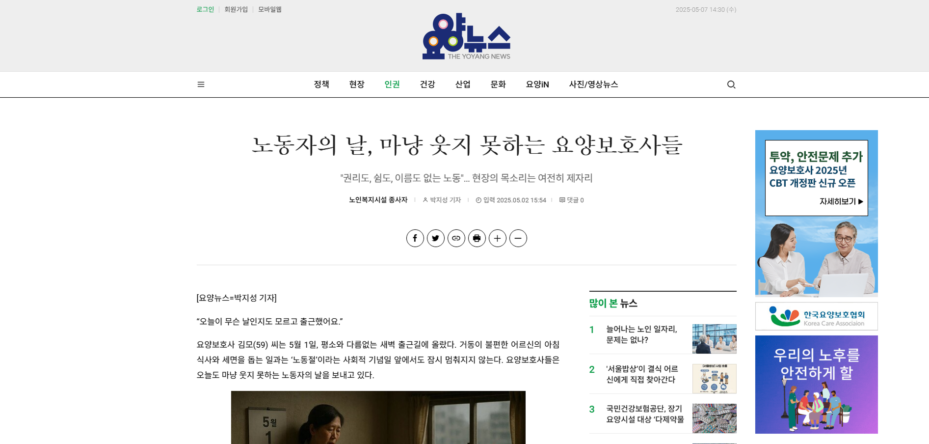 요양보호사 김모(59) 씨는 5월 1일, 평소와 다름없는 새벽 출근길에 올랐다. 거동이 불편한 어르신의 아침 식사와 세면을 돕는 일과는 ‘노동절’이라는 사회적 기념일 앞에서도 잠시 멈춰지지 않는다. 요양보호사들은 오늘도 마냥 웃지 못하는 노동자의 날을 보내고 있다.