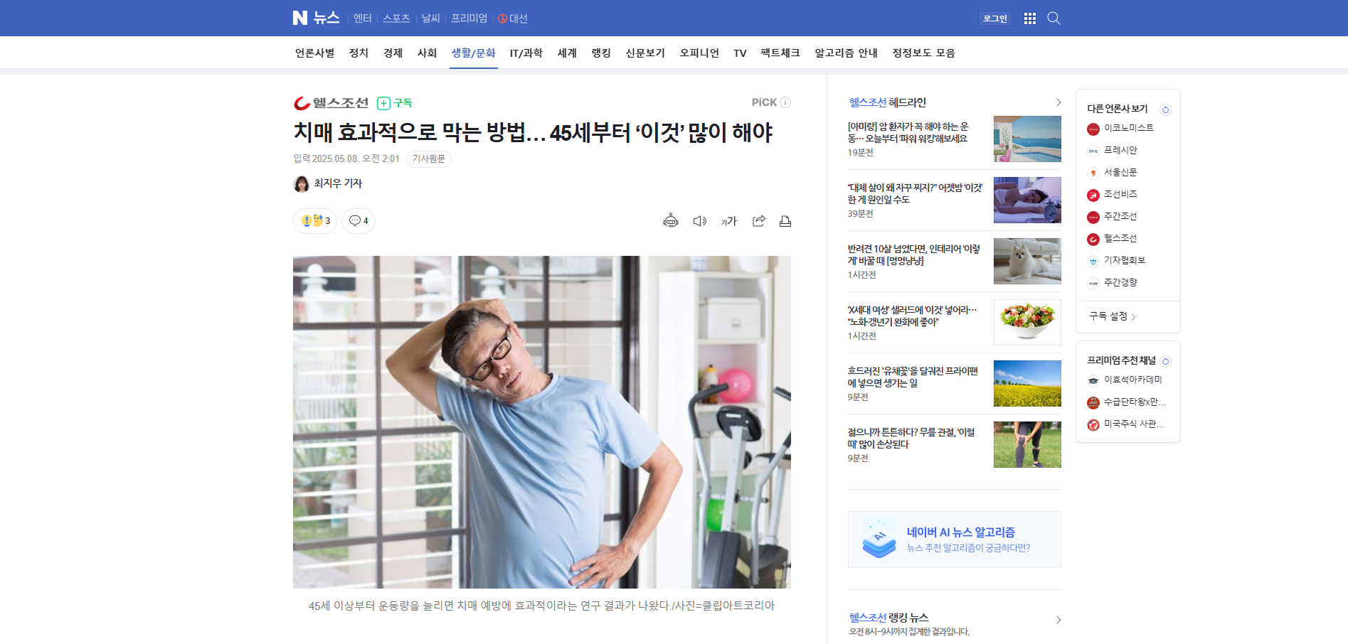 영국 알츠하이머병협회 연구 책임자 루시 데벤드라 박사는 “인생 후반기에 활동적으로 지내는 것은 기분 개선, 수면 질 향상, 신체활동시간 확보 등 다양한 이점을 가져온다”며 “운동이 직접적인 뇌 구조 변화를 일으킨다고 단정할 순 없지만 건강 전반에 유익하다는 점에서 중장년층에게 권고할 만하다”고 말했다.