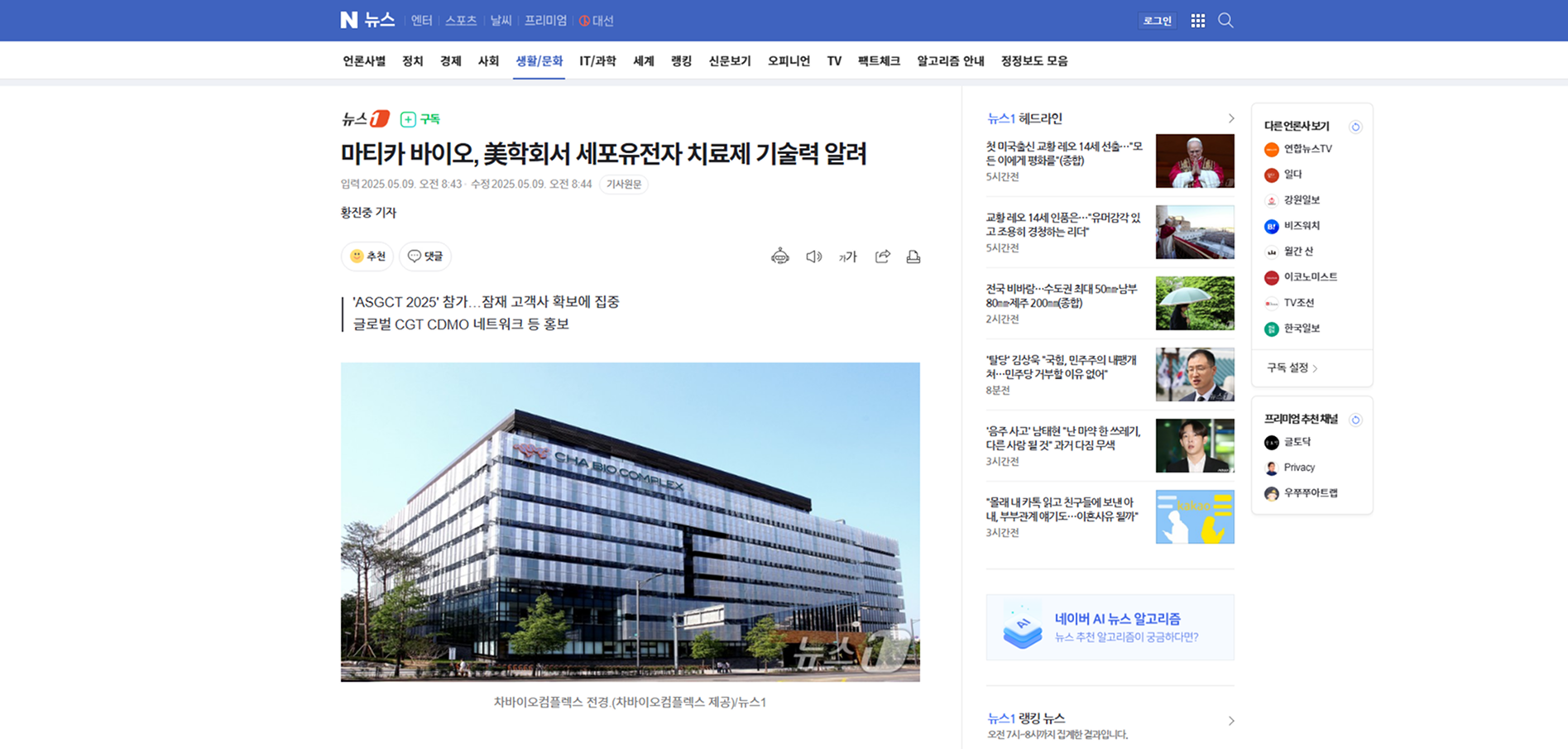(서울=뉴스1) 황진중 기자 = 차바이오텍(085660) 미국 자회사인 마티카 바이오테크놀로지(마티카 바이오)는 이달 13일부터 17일까지 미국 뉴올리언스 모리얼 컨벤션센터에서 열리는 '미국 유전자세포치료학회'(ASGCT 2025)에 참가한다고 9일 밝혔다.