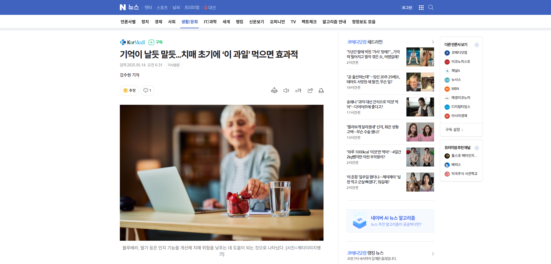 ![블루베리, 딸기 등은 인지 기능을 개선해 치매 위험을 낮추는 데 도움이 되는 것으로 나타났다. [사진=게티이미지뱅크]](https://imgnews.pstatic.net/image/296/2025/05/14/0000089477_001_20250514063110600.jpg?type=w860)