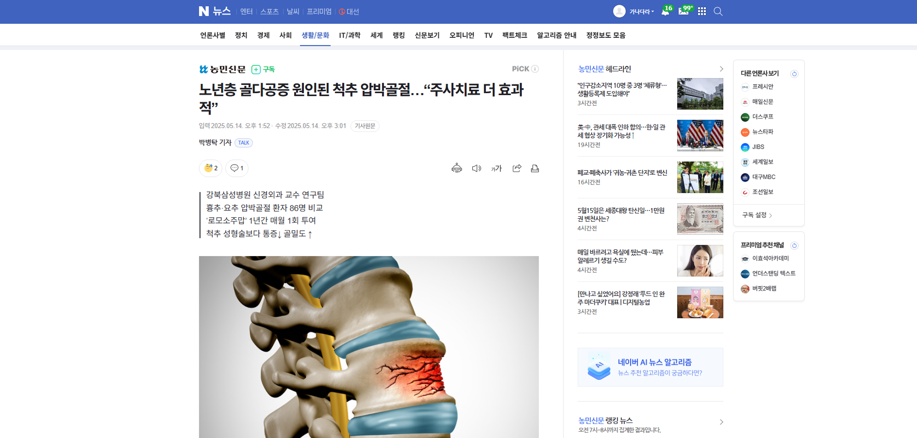 노년층 골다공증 원인된 척추 압박골절…“주사치료 더 효과적”