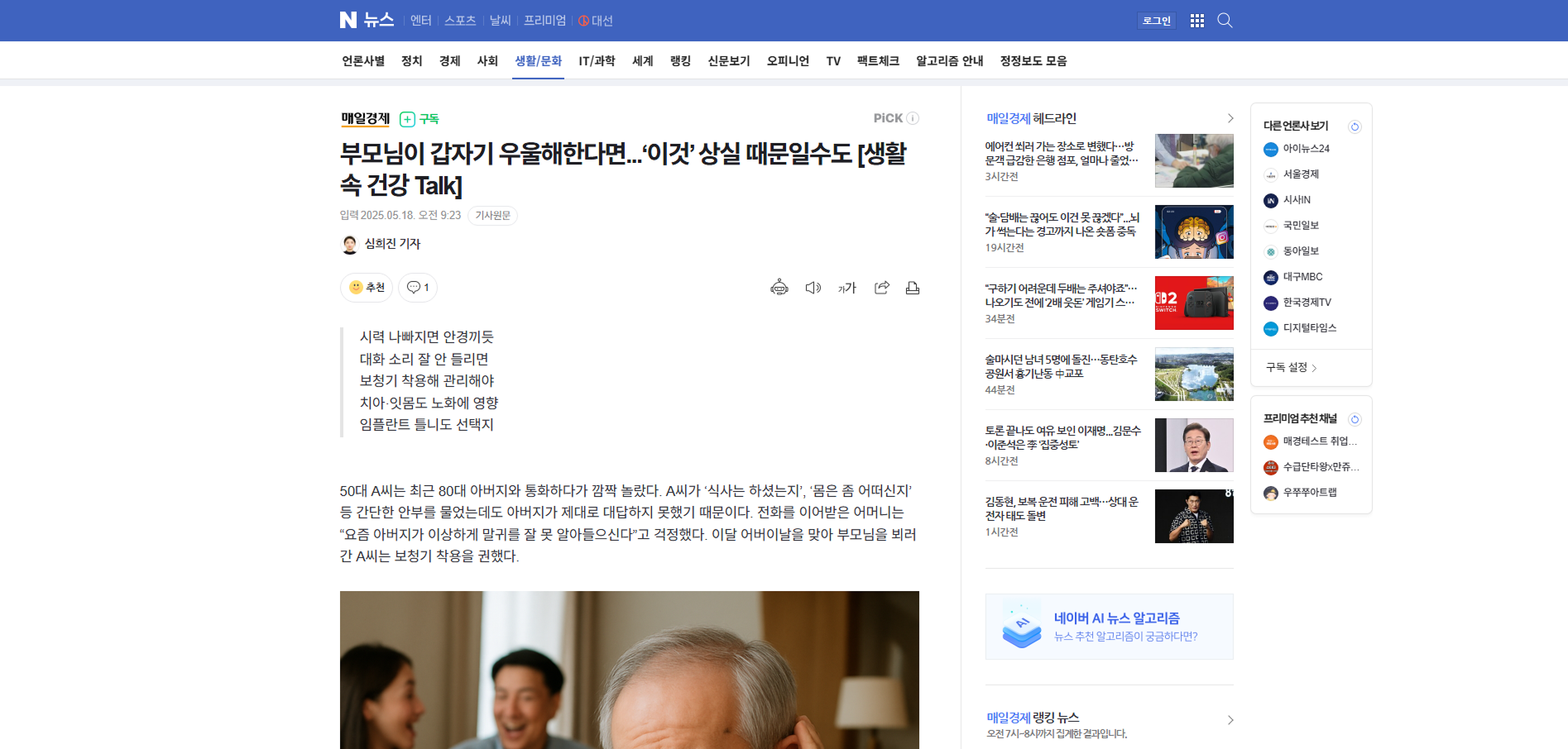 - 다음글우리 부모님은 괜찮을까…70대 이상 남성 52.9% ‘중증 난청’ 25.05.19