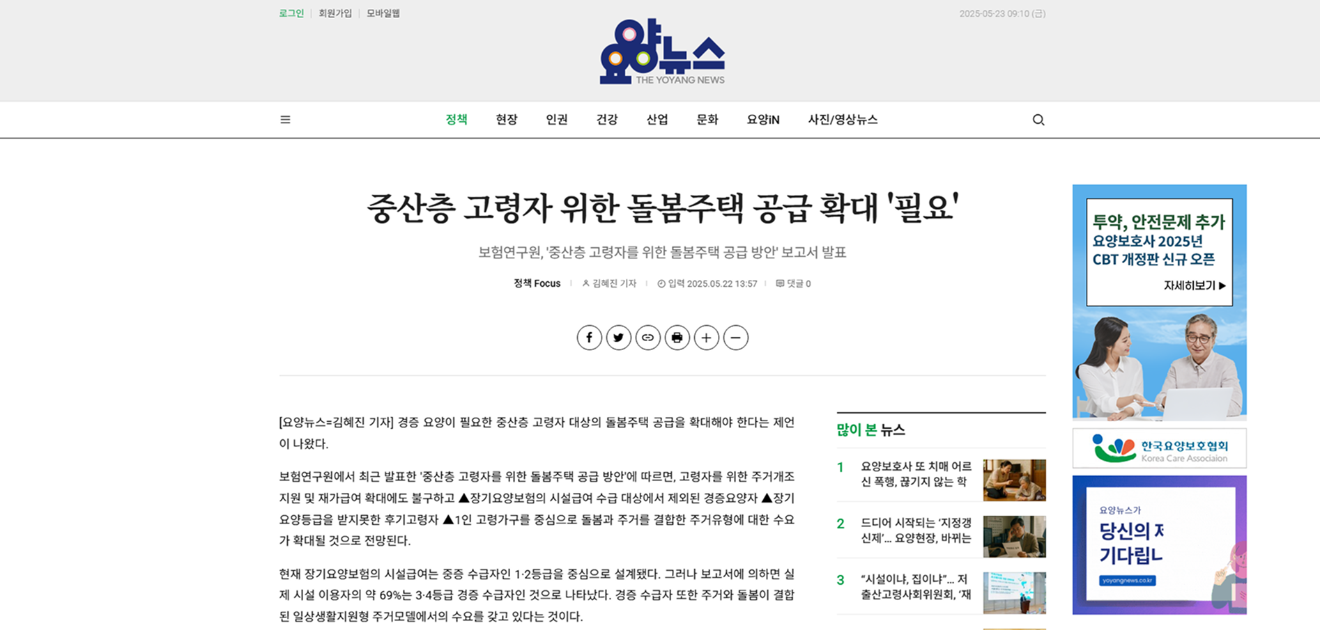 [요양뉴스=김혜진 기자] 경증 요양이 필요한 중산층 고령자 대상의 돌봄주택 공급을 확대해야 한다는 제언이 나왔다.