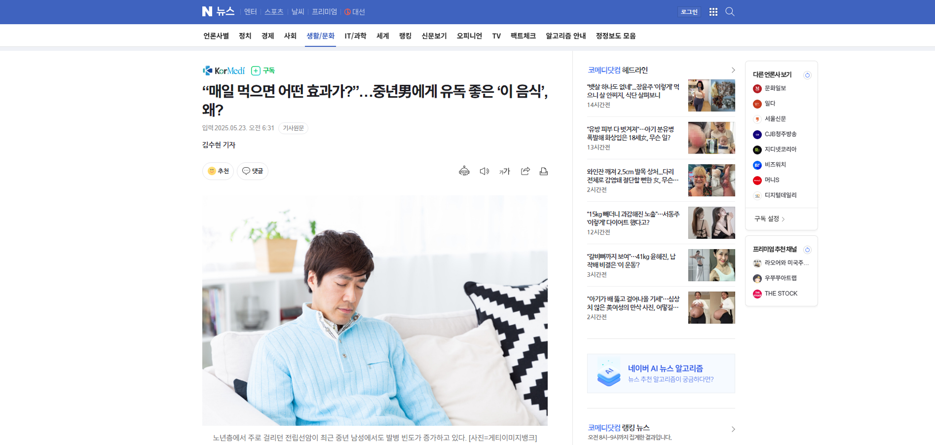 ![전립선암을 예방하려면 과체중을 벗어나 지방 섭취량을 줄이고 전립선에 좋은 음식을 섭취하는 것이 효과적이다. [사진=게티이미지뱅크]](https://imgnews.pstatic.net/image/296/2025/05/23/0000089771_002_20250523063110489.jpg?type=w860)