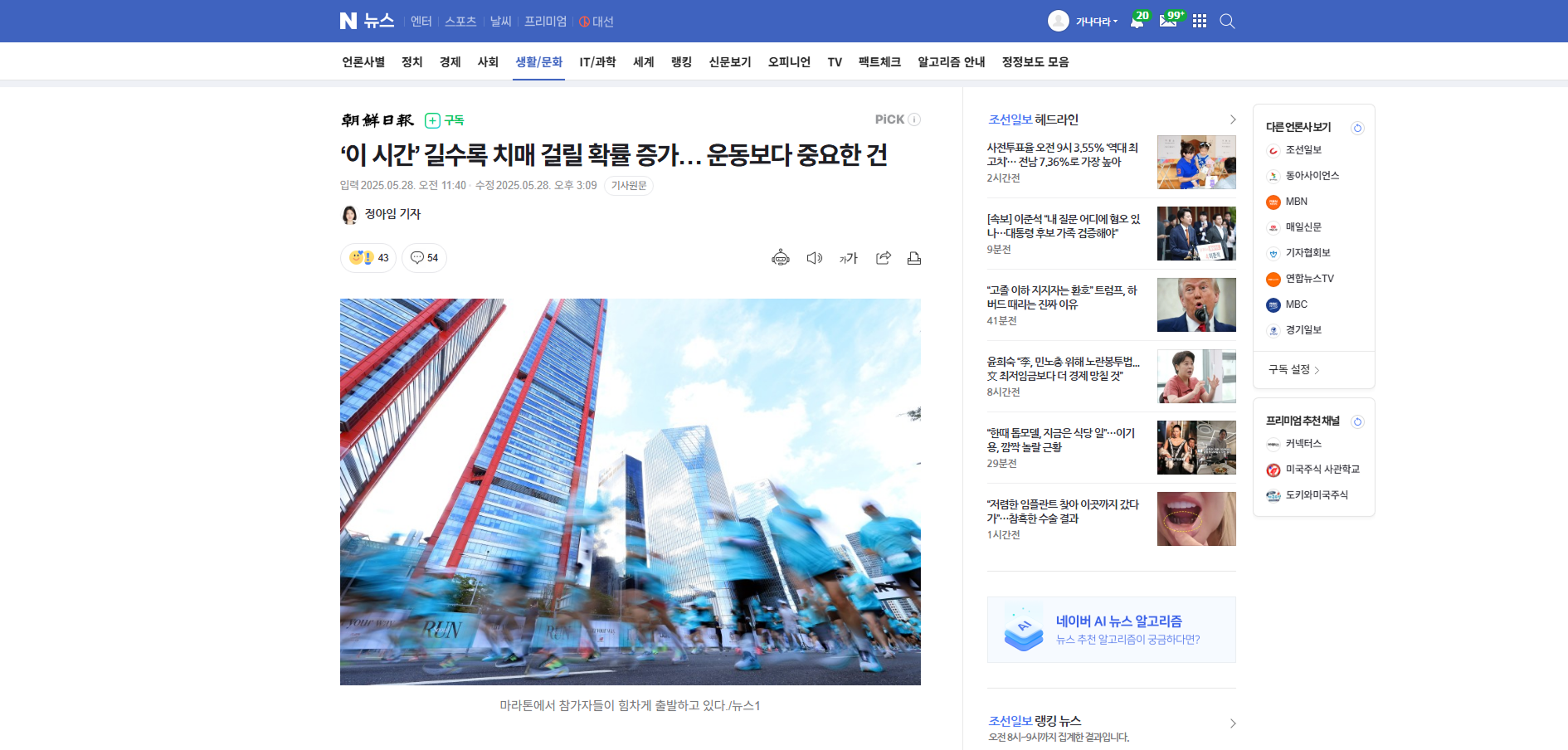 특히 이들 중 90%가량이 세계보건기구 권장 기준인 주 150분 이상 운동을 했음에도 결과는 달라지지 않았다. 연구 논문 주저자인 마리사 고그니아트 박사는 “앉거나 눕는 시간을 최소화해야 한다”고 강조했다.