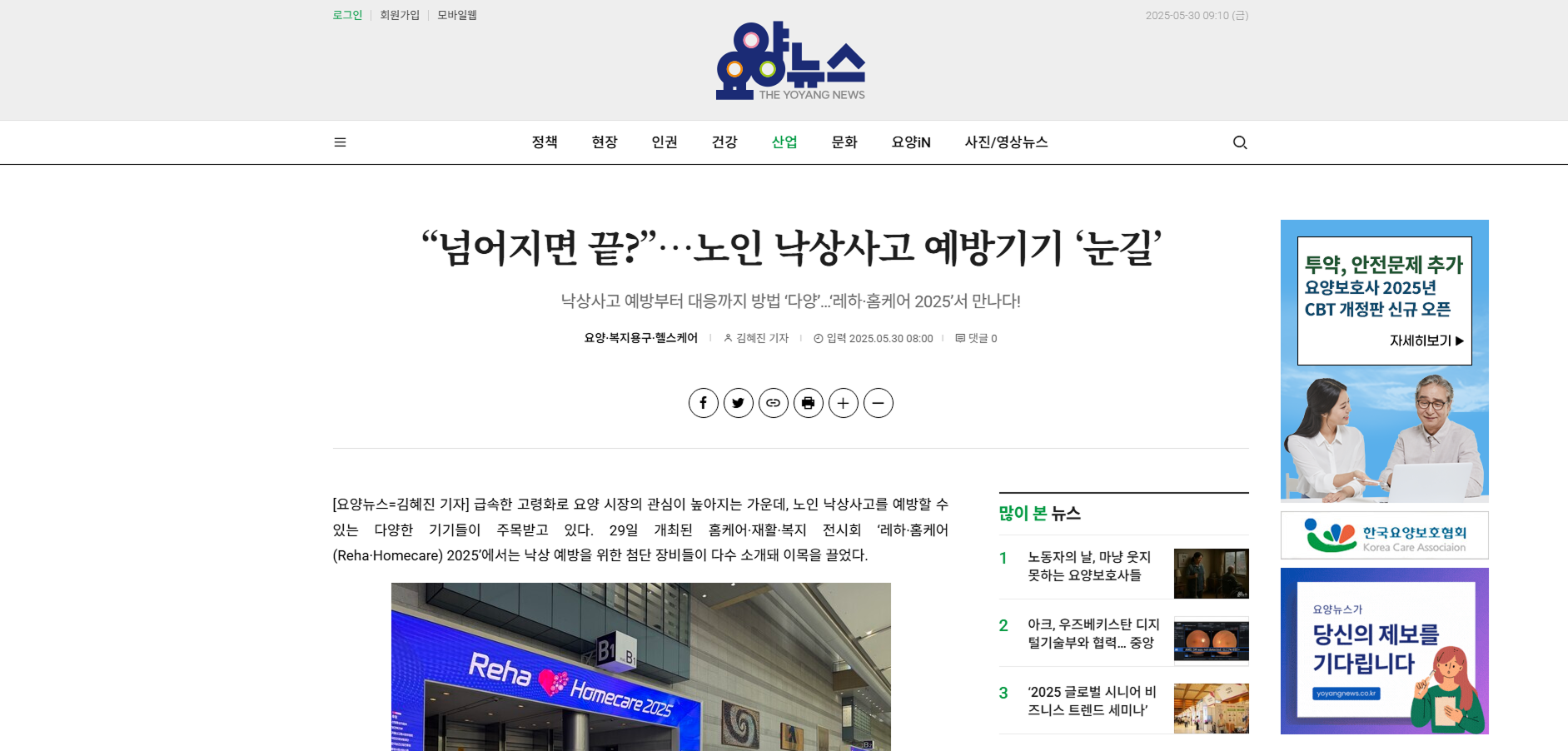 [요양뉴스=김혜진 기자] 급속한 고령화로 요양 시장의 관심이 높아지는 가운데, 노인 낙상사고를 예방할 수 있는 다양한 기기들이 주목받고 있다. 29일 개최된 홈케어·재활·복지 전시회 ‘레하·홈케어(Reha·Homecare) 2025’에서는 낙상 예방을 위한 첨단 장비들이 다수 소개돼 이목을 끌었다.