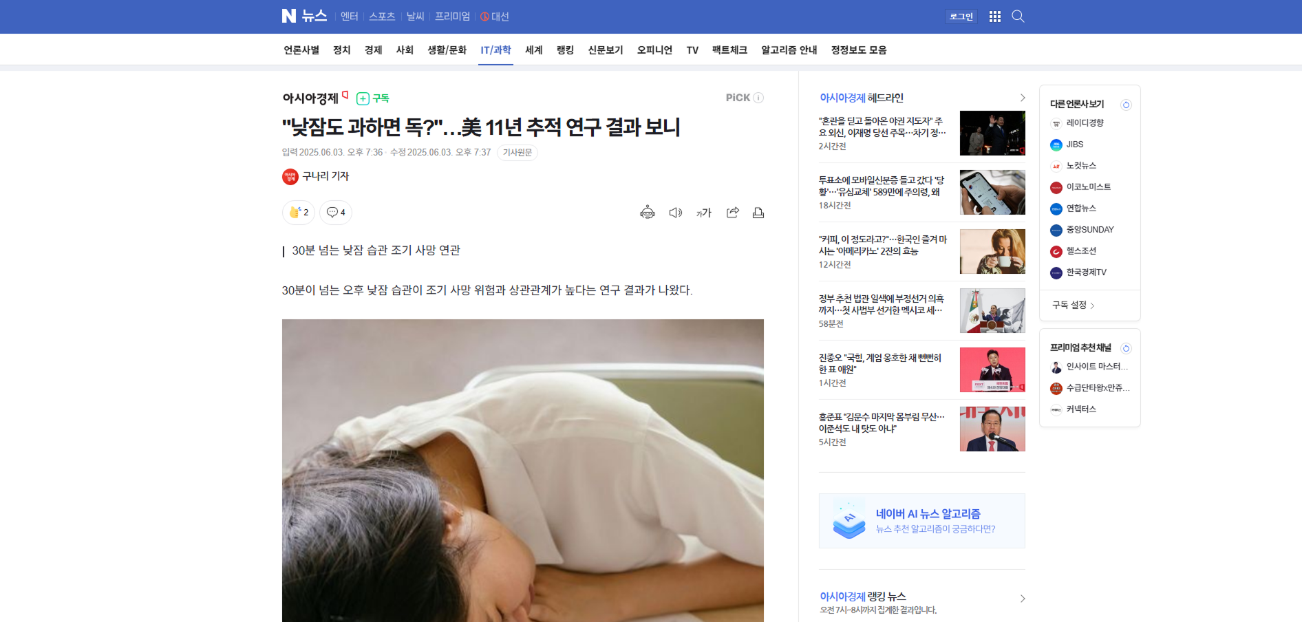 지난달 29일(현지시간) 영국 데일리메일은 미국 보스턴 매사추세츠 종합병원 연구진이 낮잠과 관련한 좋지 않은 수면 습관이 조기 사망과 상관관계가 있다는 연구 결과를 발표했다고 보도했다. 낮잠이 건강과 일과의 효율을 높이는 데 도움이 된다는 기존 연구들과 대비되는 결과가 눈길을 끈다. 해당 연구 결과는 이번 달 열리는 미국 수면전문학회(APSS)의 'SLEEP 2025' 연례 회의에서 발표될 예정이다.