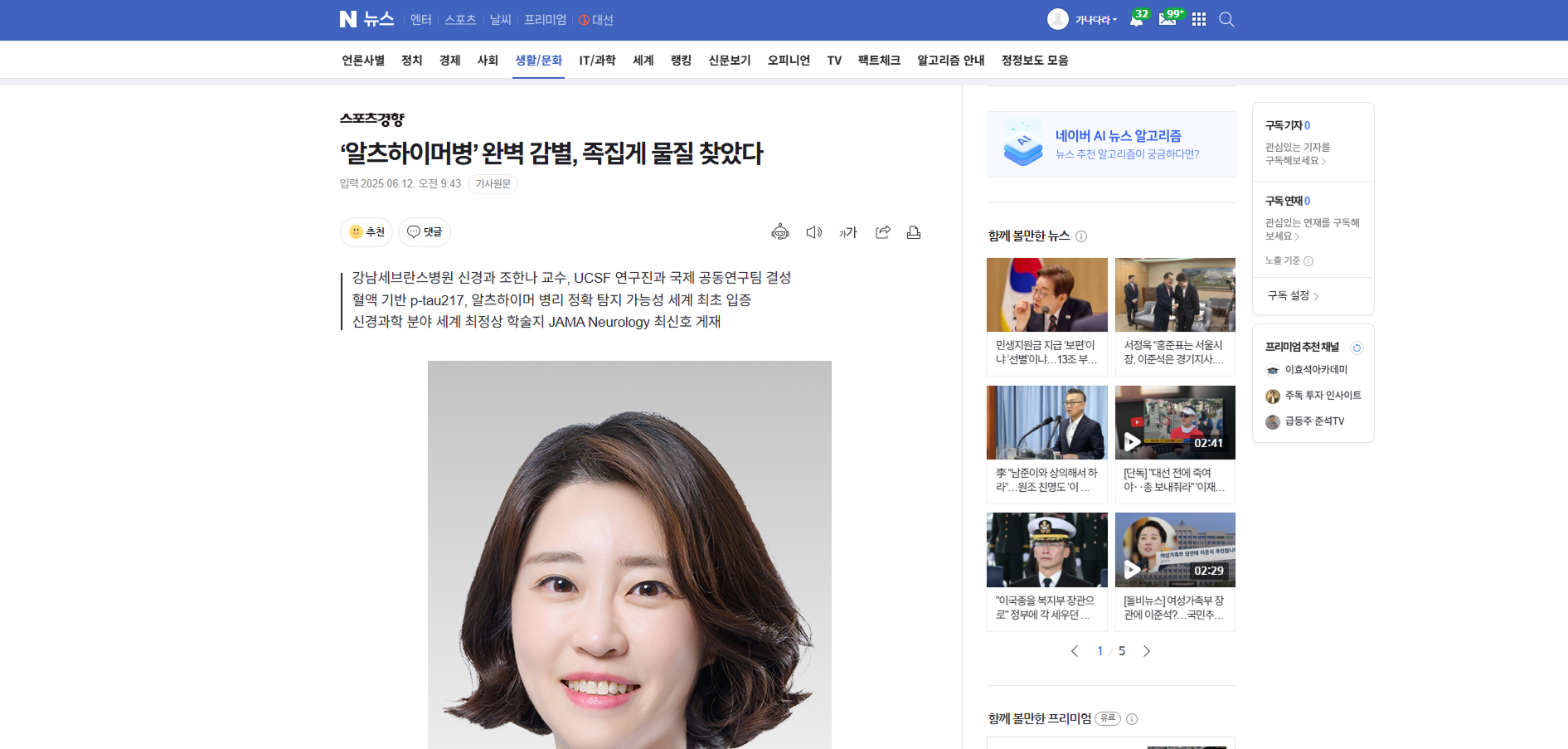 연구에 주도적 역할을 담당한 조한나 교수는 “혈액 기반 p-tau217 물질이 다양한 치매 환자군에서 알츠하이머 병리를 정확하게 탐지할 수 있음을 세계 최초로 입증했다는 점에서 연구 성과가 매우 높다. 향후 정확한 감별진단, 치료제 선택, 예후 예측 등에 p-tau217 물질이 핵심 도구가 될 것으로 보인다. 초고령사회에 진입하는 우리나라 치매 진단과 연구 환경에 획기적인 전환점이 될 뿐 아니라, 향후 혈액을 기반으로 치매 조기진단과 치료 대상자 선별 표준 정립에 세계 최정상 그룹과 함께 진행할 수 있는 발판을 마련했기에 큰 의미를 지닌다”라고 말했다.