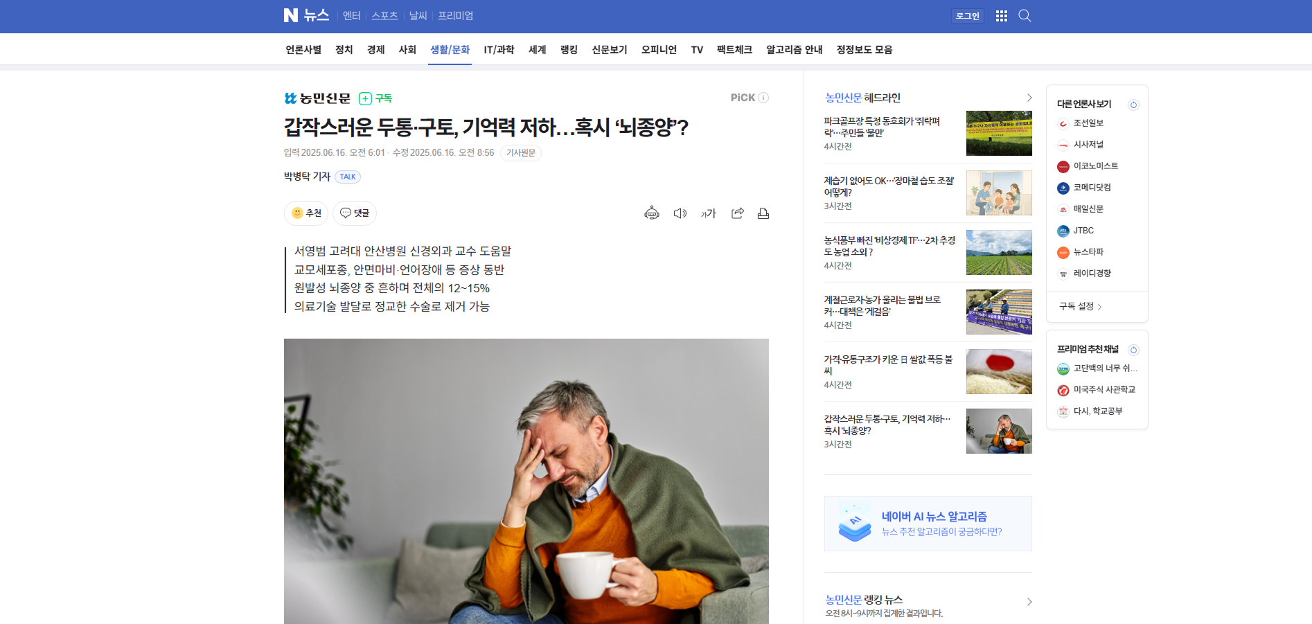 갑작스러운 두통·구토, 기억력 저하…혹시 ‘뇌종양’?