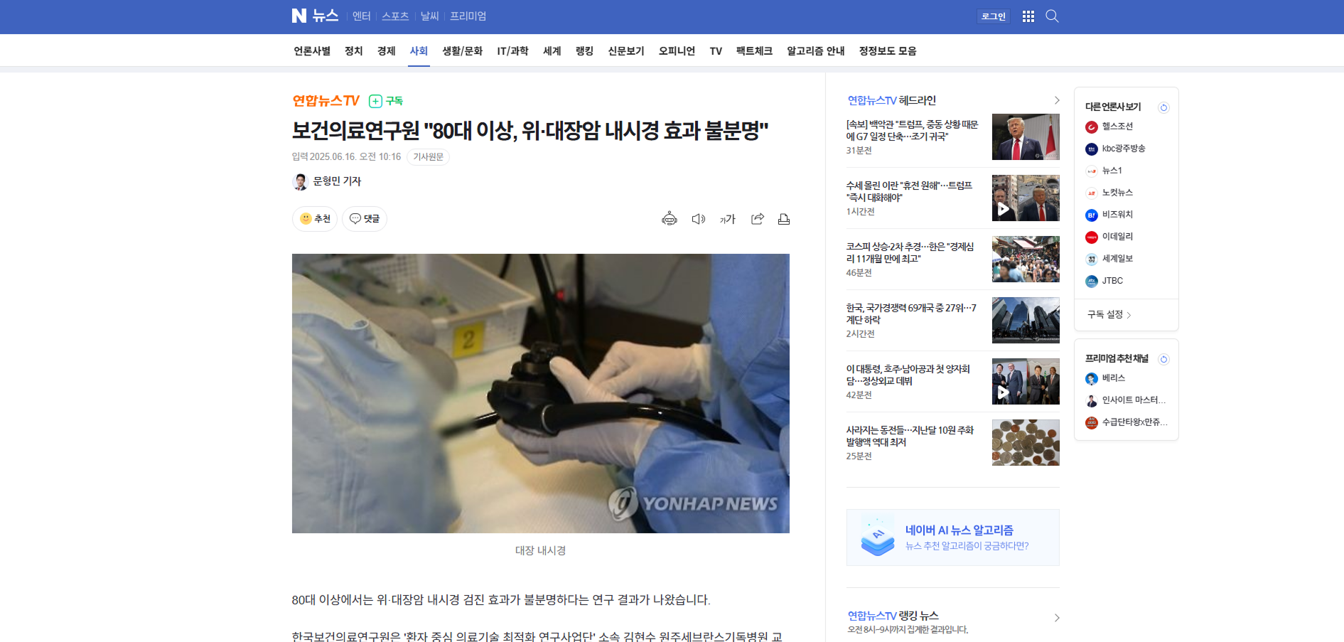 80대 이상에서는 위·대장암 내시경 검진 효과가 불분명하다는 연구 결과가 나왔습니다.