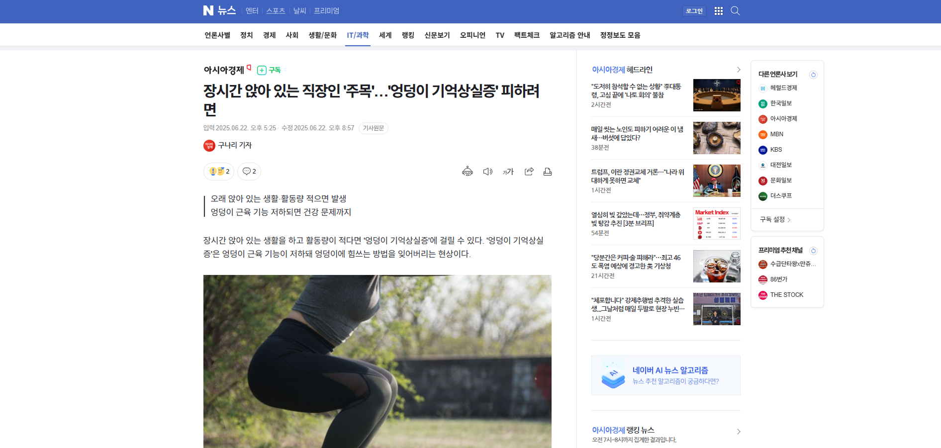 엉덩이 기억상실증은 엉덩이 근육인 대둔근이 제대로 역할을 하지 못해 햄스트링을 포함한 다른 근육이 과도하게 사용돼 근육 불균형과 통증이 발생하는 것이다. 의학적으로는 '대둔근·햄스트링 조절 장애'라고 불린다. 엉덩이 모양이 납작해지고 탄력이 줄어드는 것이 특징이다. 특히 등받이에 기대 허리를 구부리고 오래 앉아 있을 경우 엉덩이 근육 활성도가 저하돼 다리를 들 때 엉덩이 대신 허벅지 뒤쪽이나 허리 근육이 과도하게 사용된다. 이는 허리 통증, 골반 비틀림, 고관절과 무릎 통증 등 다양한 문제로 이어질 수 있다.