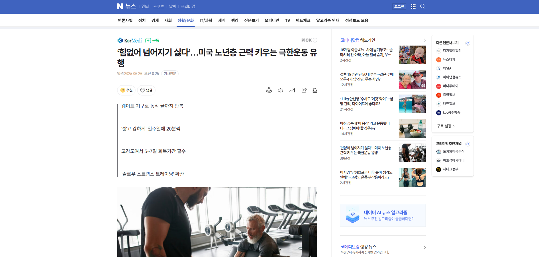 ![미국에서 노년층 남성이 트레이너의 지도 아래 웨이트 트레이닝을 받고 있다. 노년층의 근육 강화는 활동력을 높이고 사고 가능성을 줄여준다. [사진=게티이미지]](https://imgnews.pstatic.net/image/296/2025/06/26/0000090751_001_20250626082513805.jpg?type=w860)