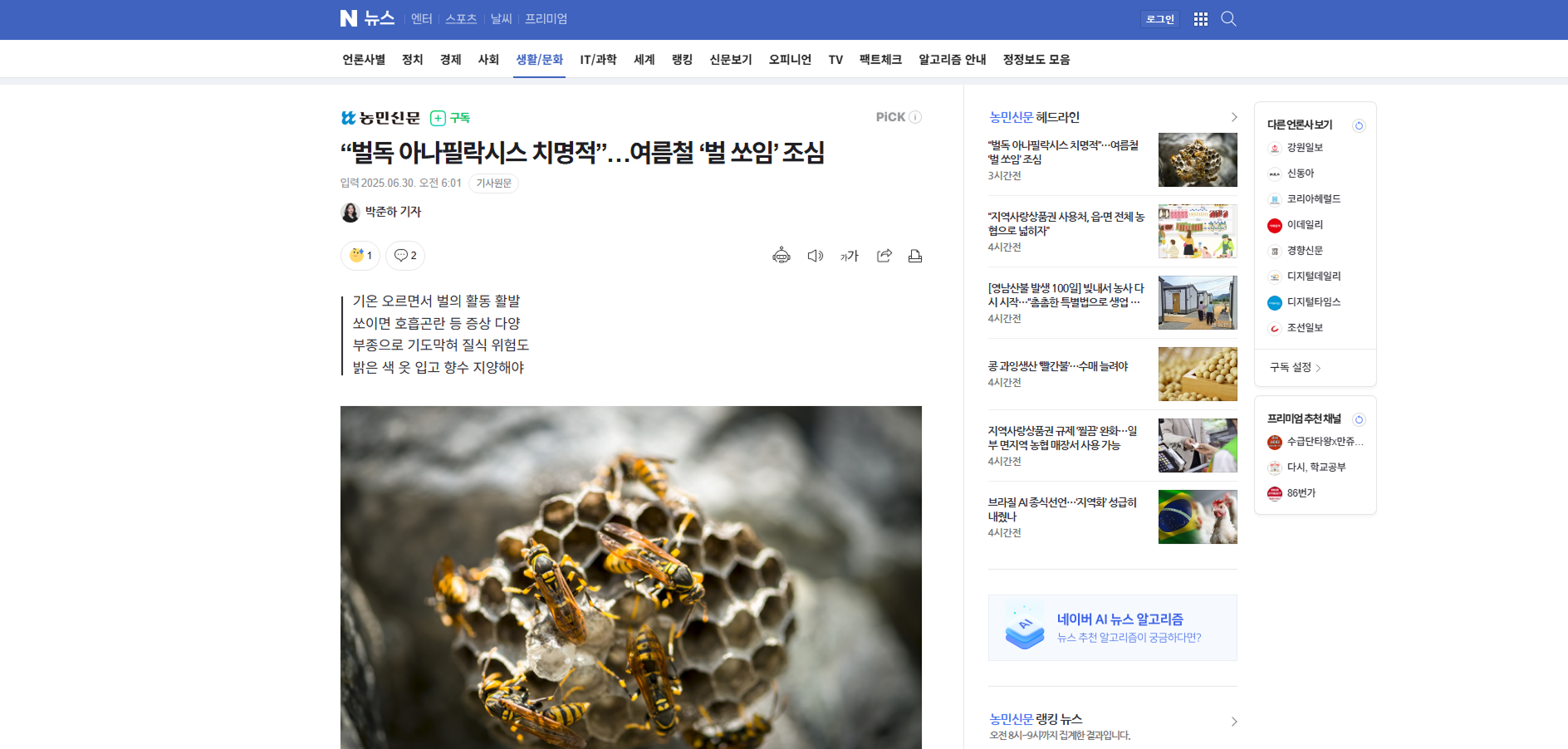 이같은 사고는 비단 외국인의 일은 아니다. 여름철에는 벌의 활동이 활발해지는 시기로 국내에서도 벌 쏘임 사고가 급증한다. 특히 벌독에 민감한 사람은 쏘인 직후 곧바로 아나필락시스 증상이 나타날 수 있어 각별한 대비가 요구된다.
