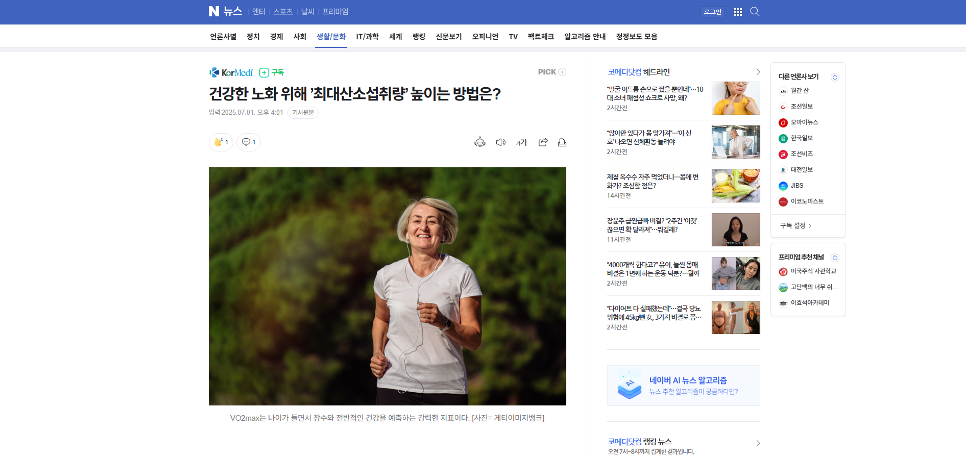 ![VO2max는 나이가 들면서 장수와 전반적인 건강을 예측하는 강력한 지표이다. [사진= 게티이미지뱅크]](https://imgnews.pstatic.net/image/296/2025/07/01/0000090897_001_20250701160109330.jpg?type=w860)
