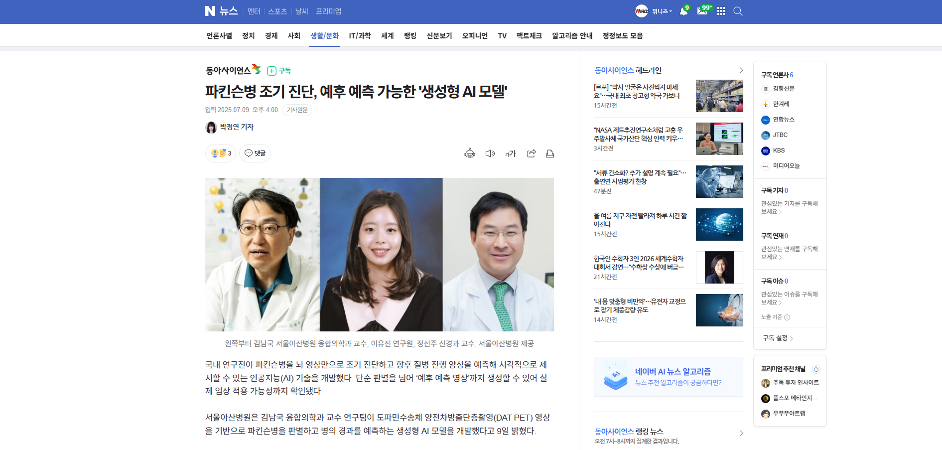 김남국 교수는 “단순 진단을 넘어 진행 예측 영상까지 생성할 수 있는 AI 기술을 실제 임상에 적용한 사례로 앞으로 다른 퇴행성 뇌질환에도 확장해갈 계획”이라고 밝혔다. 연구 결과는 국제학술지 '셀 리포츠 메디신'에 지난달 27일 게재됐다.