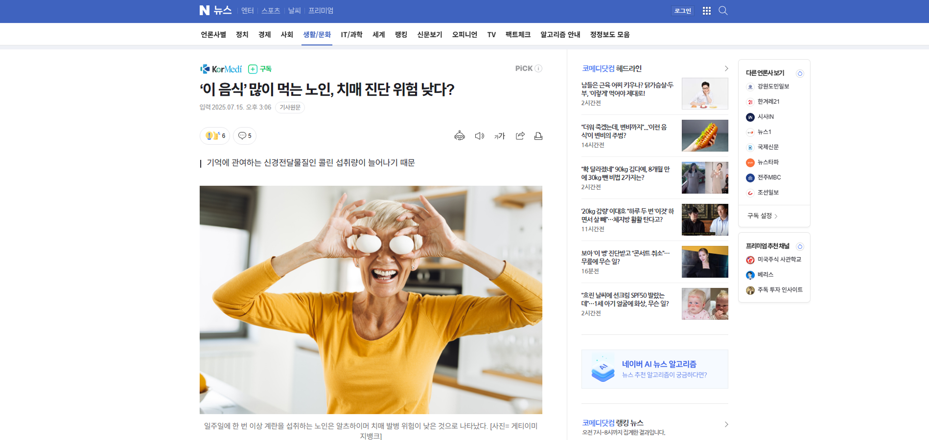 ![일주일에 한 번 이상 계란을 섭취하는 노인은 알츠하이머 치매 발병 위험이 낮은 것으로 나타났다. [사진= 게티이미지뱅크]](https://imgnews.pstatic.net/image/296/2025/07/15/0000091295_001_20250715150609291.jpg?type=w860)