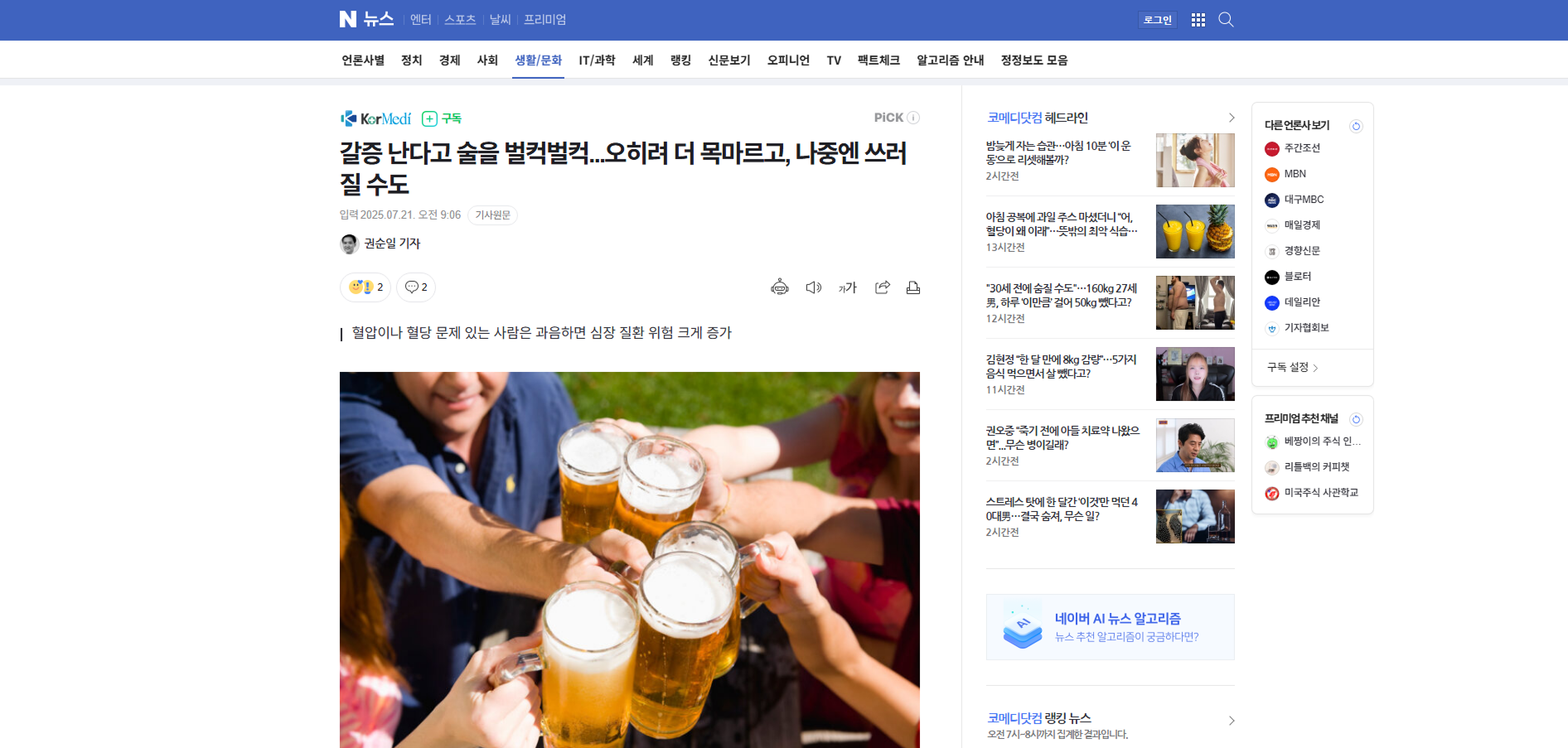 ![무더운 여름철 갈증이 난다고 술을 많이 마시면 오히려 탈수 증상을 유발하고, 심장 질환 위험을 높일 수 있다. [사진=클립아트코리아]](https://imgnews.pstatic.net/image/296/2025/07/21/0000091438_001_20250721090611662.jpg?type=w860)