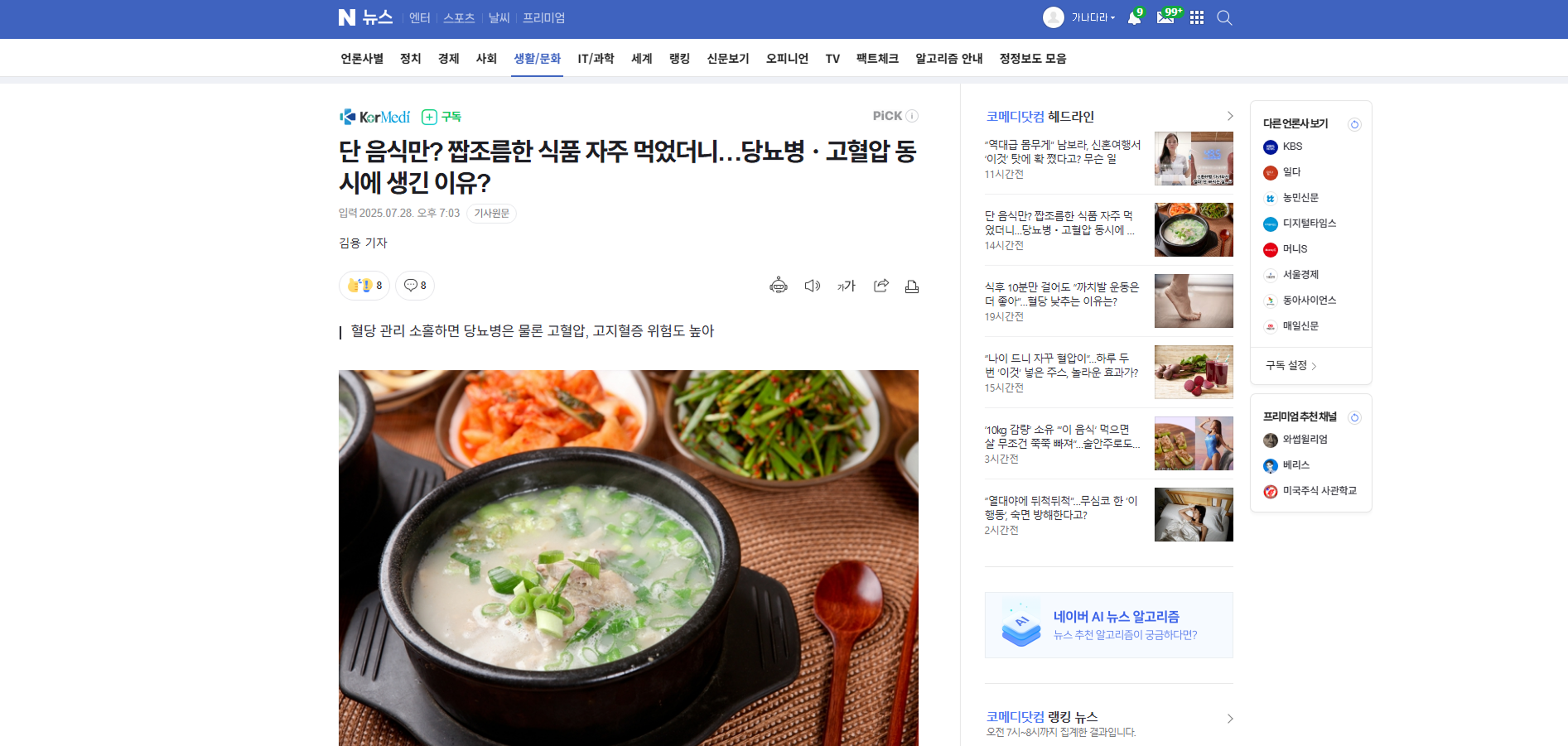 ![설렁탕, 곰탕을 먹을 때도 소금부터 넣지 말고 염분을 조절해야 고혈압, 당뇨병 위험을 낮출 수 있다. [사진=게티이미지뱅크]](https://imgnews.pstatic.net/image/296/2025/07/28/0000091647_001_20250728190310150.jpg?type=w860)
