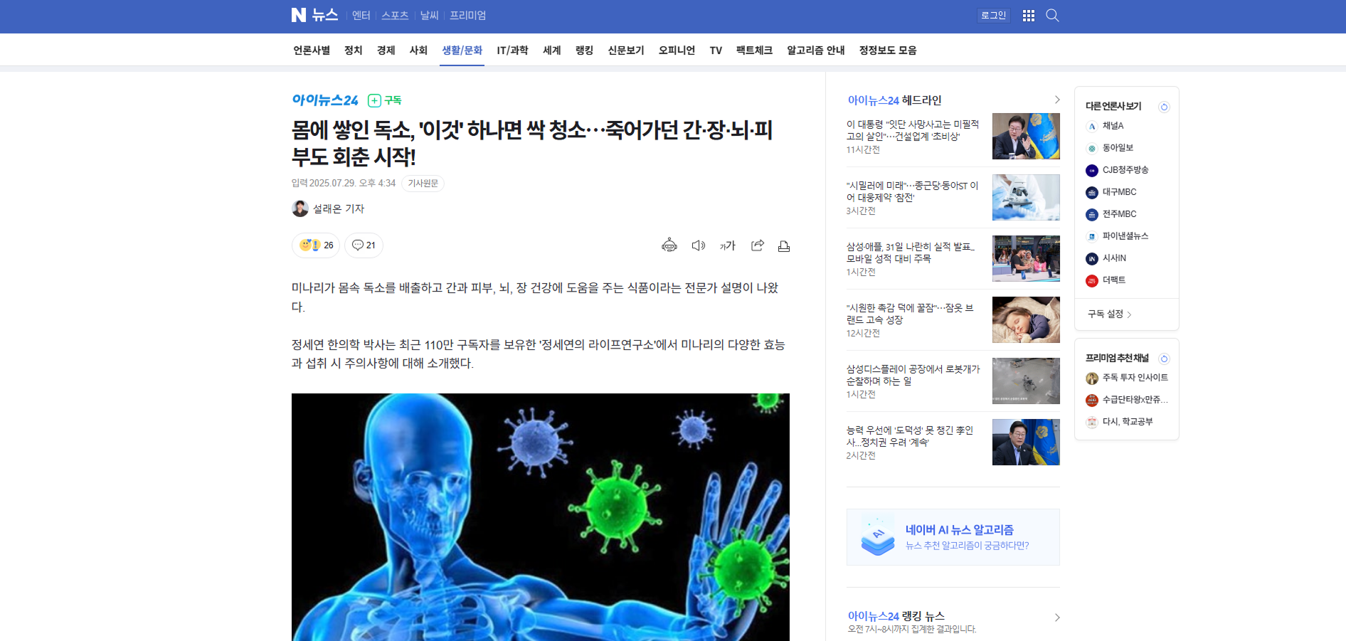 ![미나리가 몸속 독소를 배출하고 간과 피부, 뇌, 장 건강에 도움을 주는 식품이라는 전문가 설명이 공개됐다. 사진은 본 기사 내용과 무관. [사진=lamuscle]](https://imgnews.pstatic.net/image/031/2025/07/29/0000952802_001_20250729163408757.jpg?type=w860)