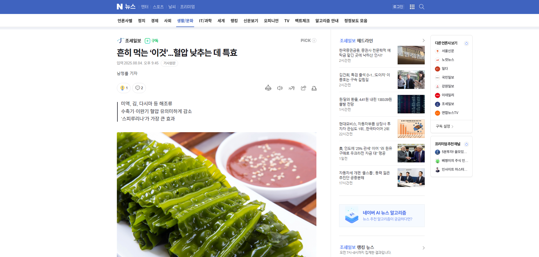 영국 플리머스대 연구팀은 최근 국제학술지 'Journal of Human Nutrition and Dietetics'에 "해조류 섭취가 수축기·이완기 혈압을 유의미하게 감소시킨다"는 연구 결과를 발표했다.