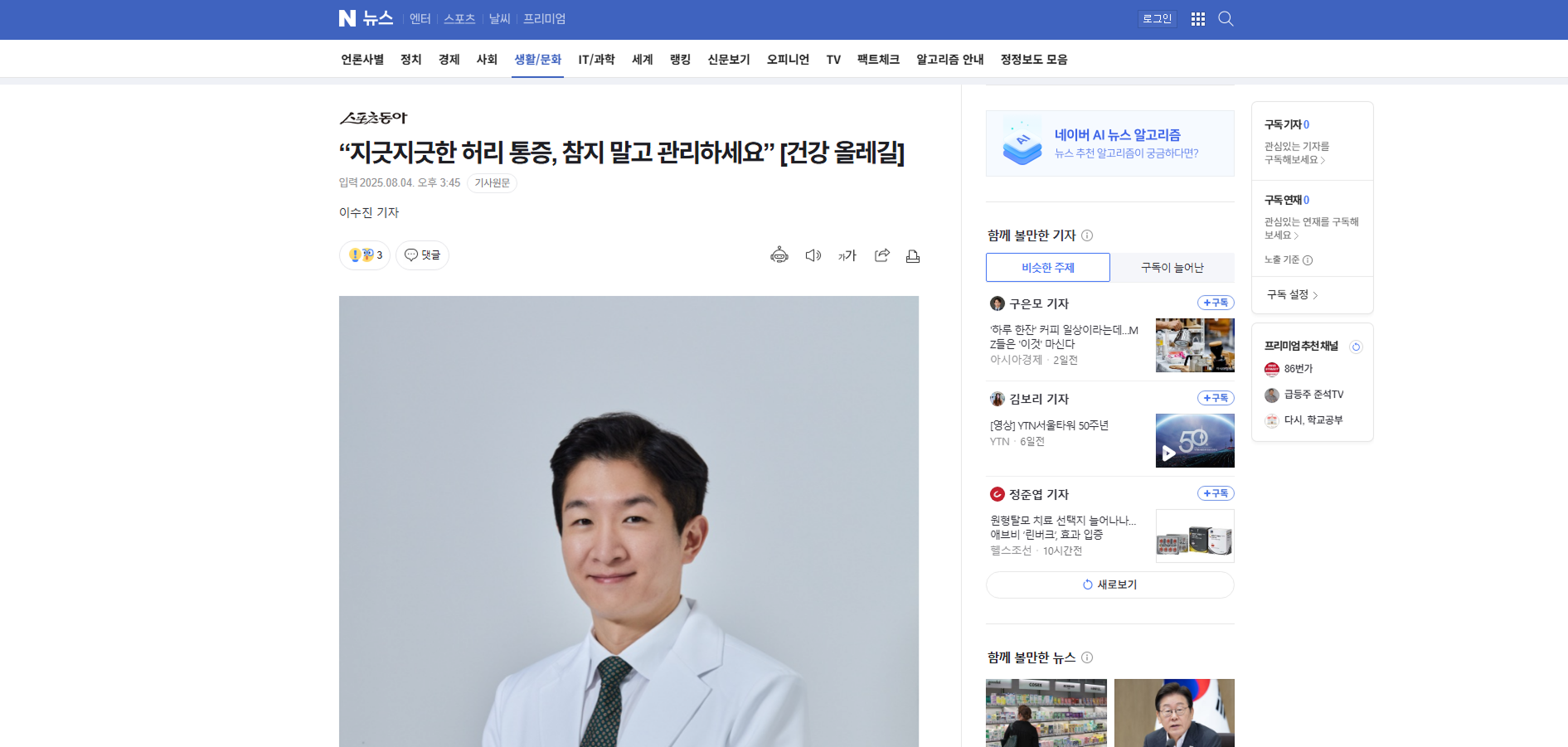 그는 “이때는 약물, 물리치료, 도수치료, 신경차단술 등 보존적 치료만으로도 일상 복귀가 가능한 경우가 많기에 초기 진료가 중요하다”고 말했다.