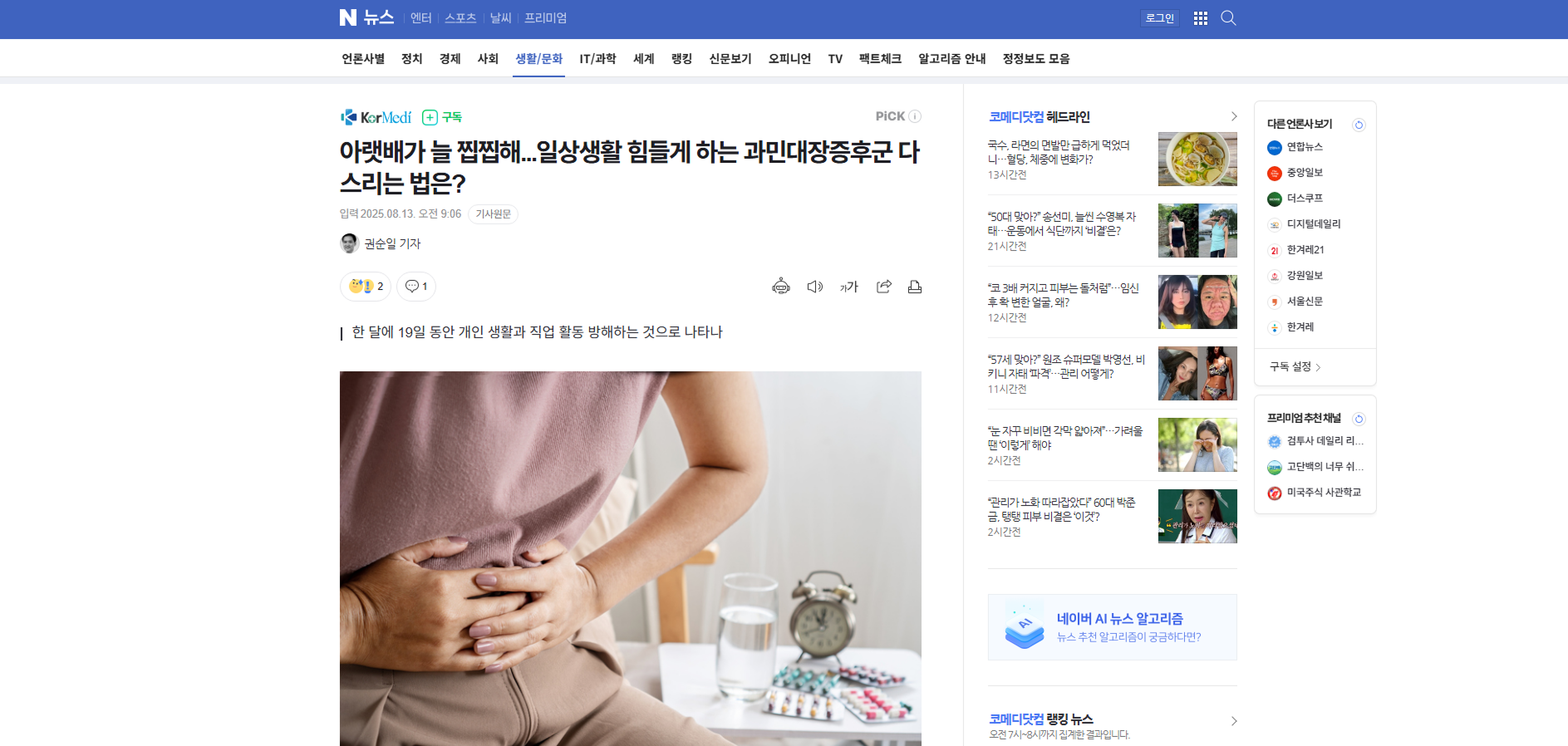 ![과민 대장 증후군이 있는 사람은 한 달에 19일 동안 개인 생활과 직업 활동에 방해를 받는 것으로 나타났다. [사진=게티이미지뱅크]](https://imgnews.pstatic.net/image/296/2025/08/13/0000092045_001_20250813090617402.jpg?type=w860)