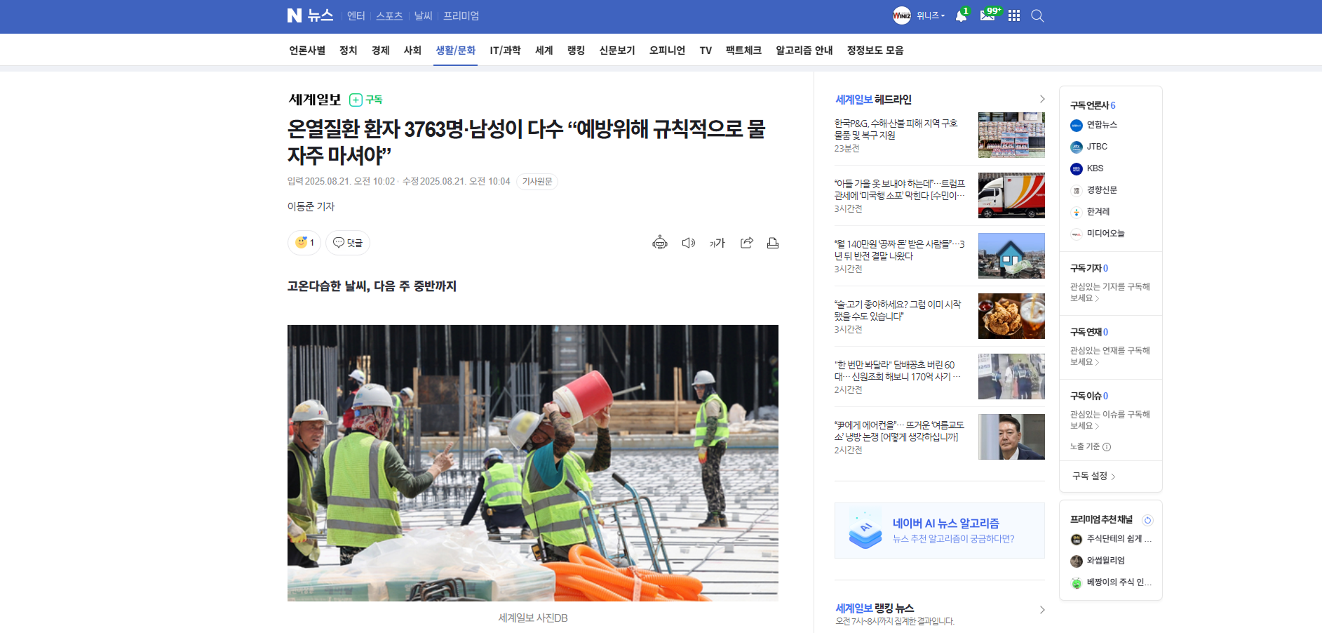 온열질환 환자 3763명·남성이 다수 “예방위해 규칙적으로 물 자주 마셔야”