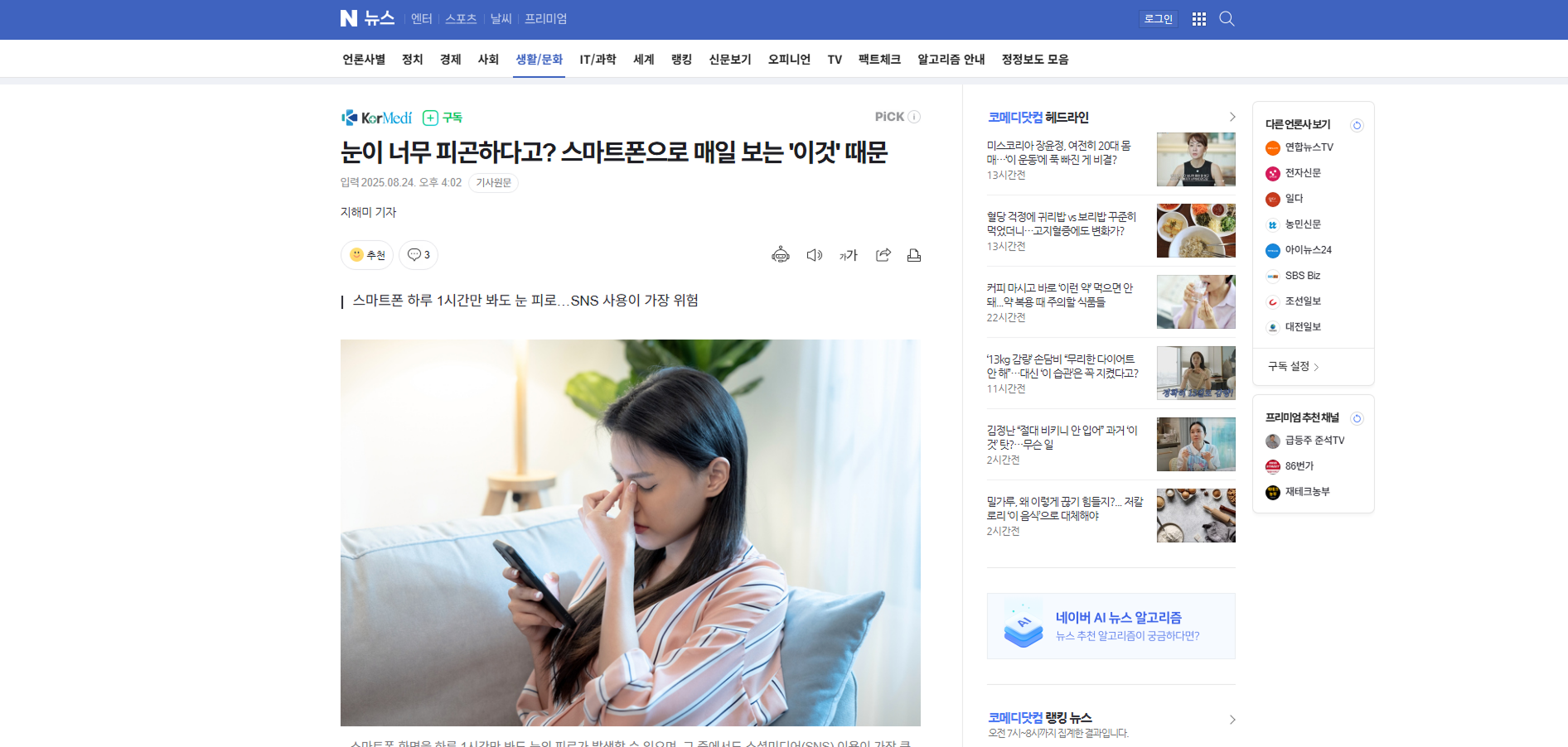 ![스마트폰 화면을 하루 1시간만 봐도 눈의 피로가 발생할 수 있으며, 그 중에서도 소셜미디어(SNS) 이용이 가장 큰 부담을 준다는 연구 결과가 나왔다. [사진=게티이미지뱅크]](https://imgnews.pstatic.net/image/296/2025/08/24/0000092326_001_20250824160210109.jpg?type=w860)