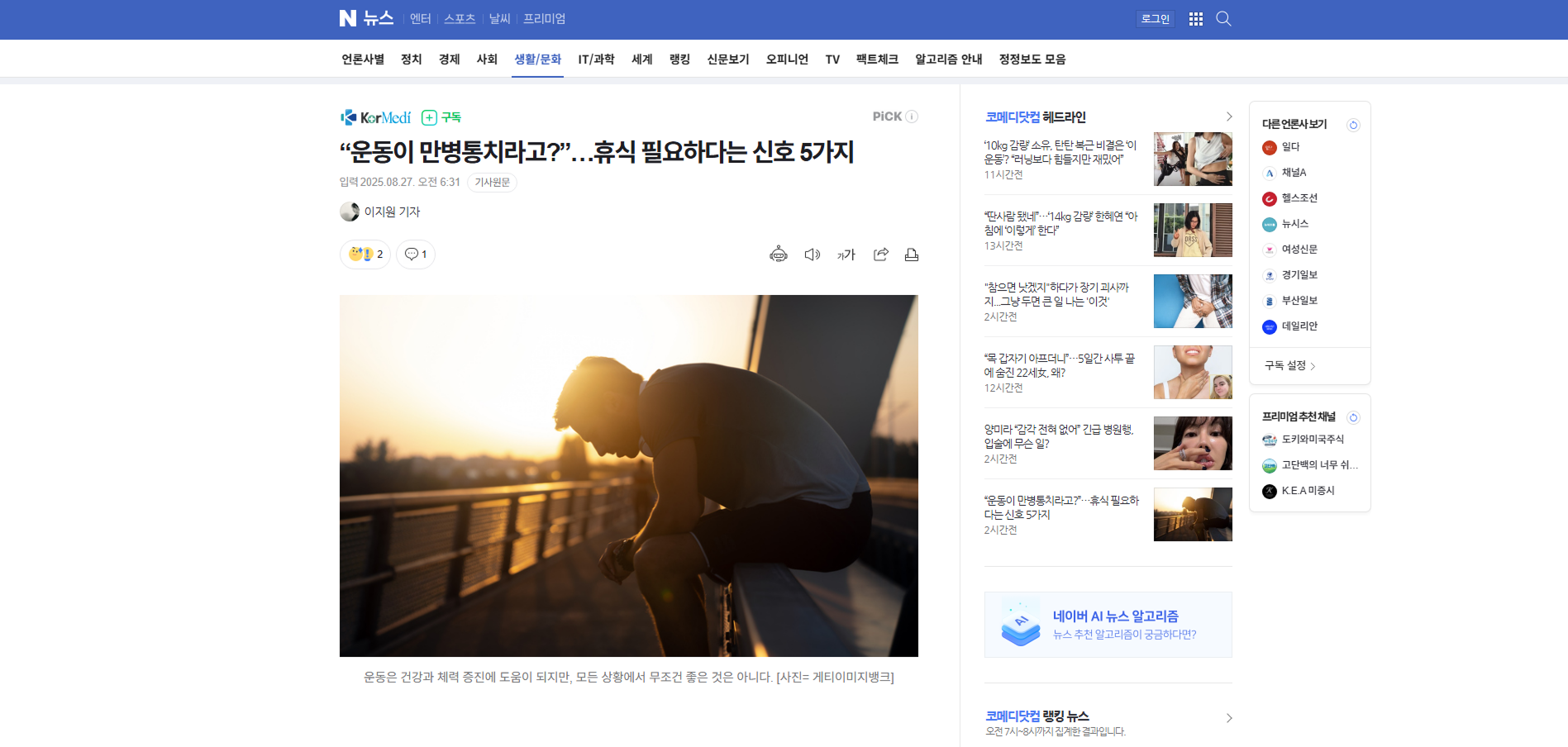 ![운동은 건강과 체력 증진에 도움이 되지만, 모든 상황에서 무조건 좋은 것은 아니다. [사진= 게티이미지뱅크]](https://imgnews.pstatic.net/image/296/2025/08/27/0000092406_001_20250827083808972.jpg?type=w860)