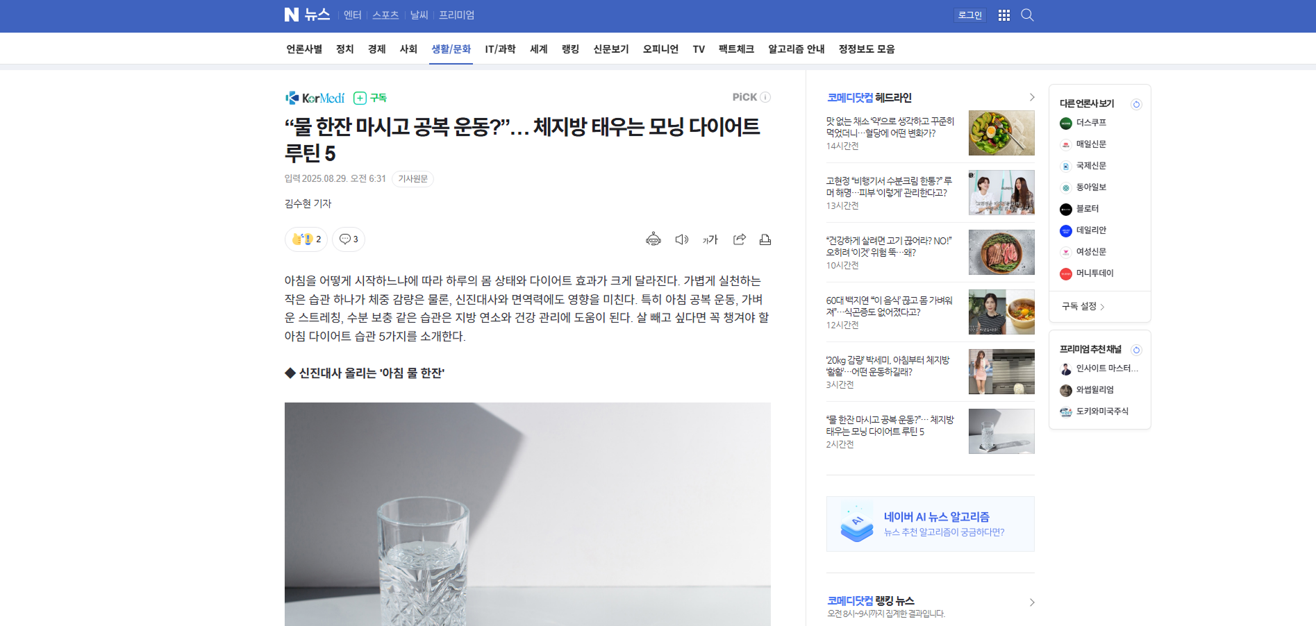 ![아침에 물을 마시는 습관은 지방 연소와 건강 관리에 이롭다. [사진=게티이미지뱅크]](https://imgnews.pstatic.net/image/296/2025/08/29/0000092469_001_20250829063108652.jpg?type=w860)