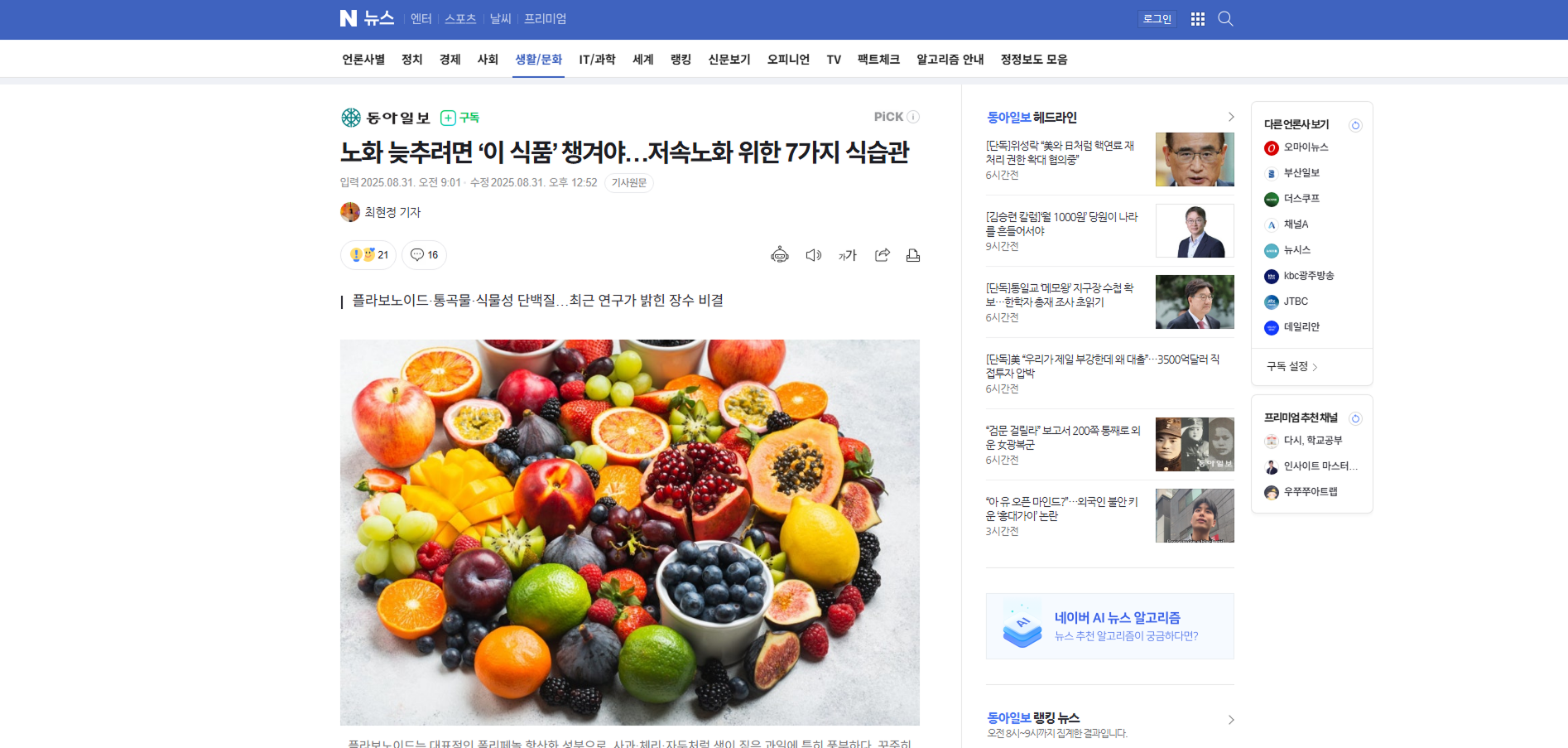 대부분의 사람들은 단순히 오래 사는 것보다 오래 살되 건강하게 늙고 싶어 한다. 최근 발표된 2025년 연구 결과에 따르면 플라보노이드, 식이섬유, 식물성 단백질 같은 특정 식품이 노화를 늦추고 건강 수명을 늘리는 핵심 열쇠로 확인됐다. 최신 연구를 토대로, ‘잘 늙기 위해 꼭 챙겨야 할 7가지 식습관’을 소개한다.