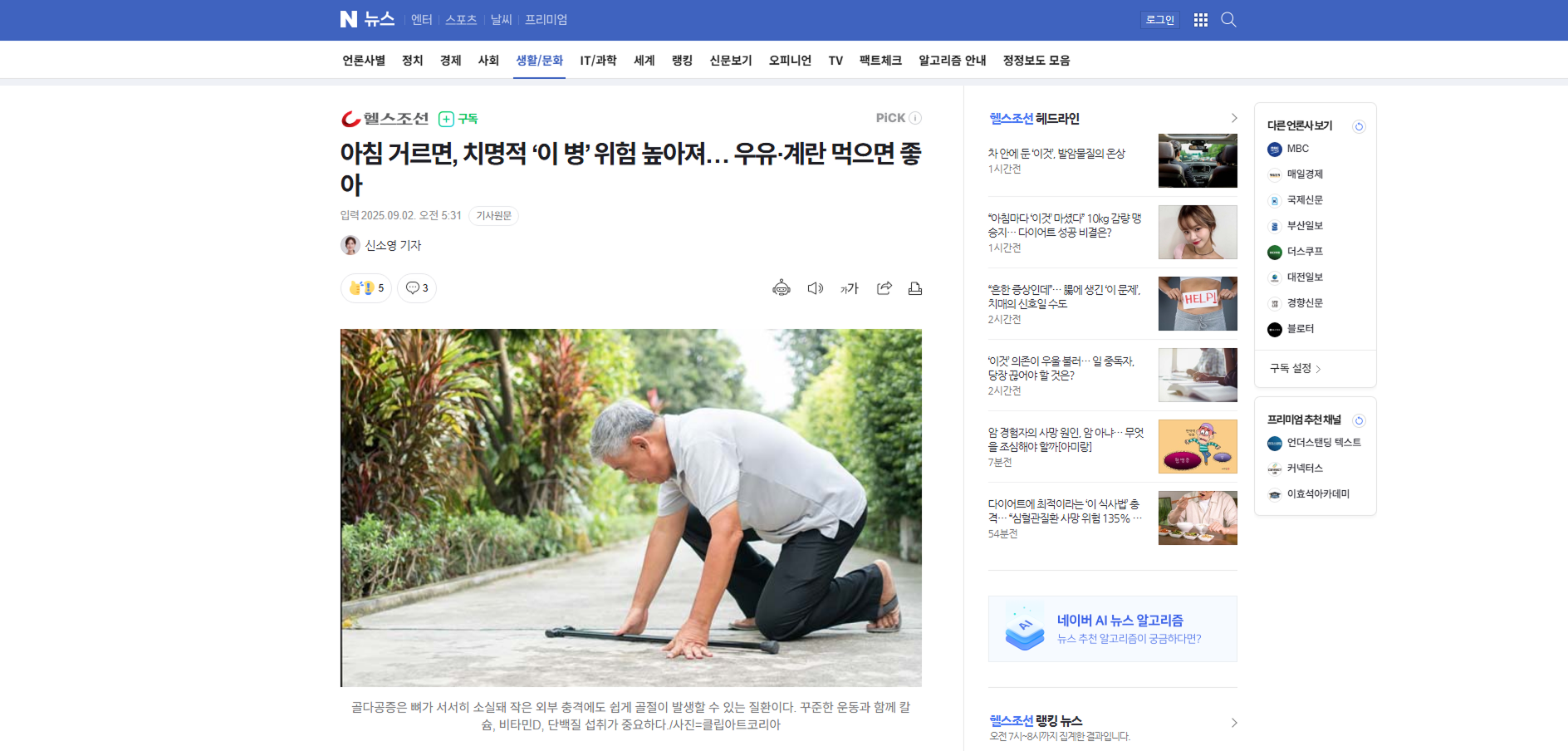 한편, 노년층에게 흔한 골다공증은 뼈가 서서히 소실돼 작은 외부 충격에도 쉽게 골절이 발생할 수 있는 질환이다. 특히 나이가 들수록 척추와 고관절 부위의 골절 발생 위험이 높아지며, 이러한 골다공증 골절은 심각한 합병증으로 이어질 수 있고, 심한 경우 생명까지 위협할 수 있어 주의가 필요하다. 골다공증 골절 예방에는 평소 꾸준한 운동과 함께 칼슘, 비타민D, 단백질을 충분히 섭취해야 한다고 알려졌다. 이 영양소는 우유, 계란, 채소 등에 풍부하게 들었다.