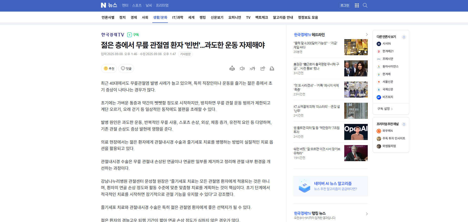 젊은 층에서 무릎 관절염 환자 '빈번'...과도한 운동 자제해야