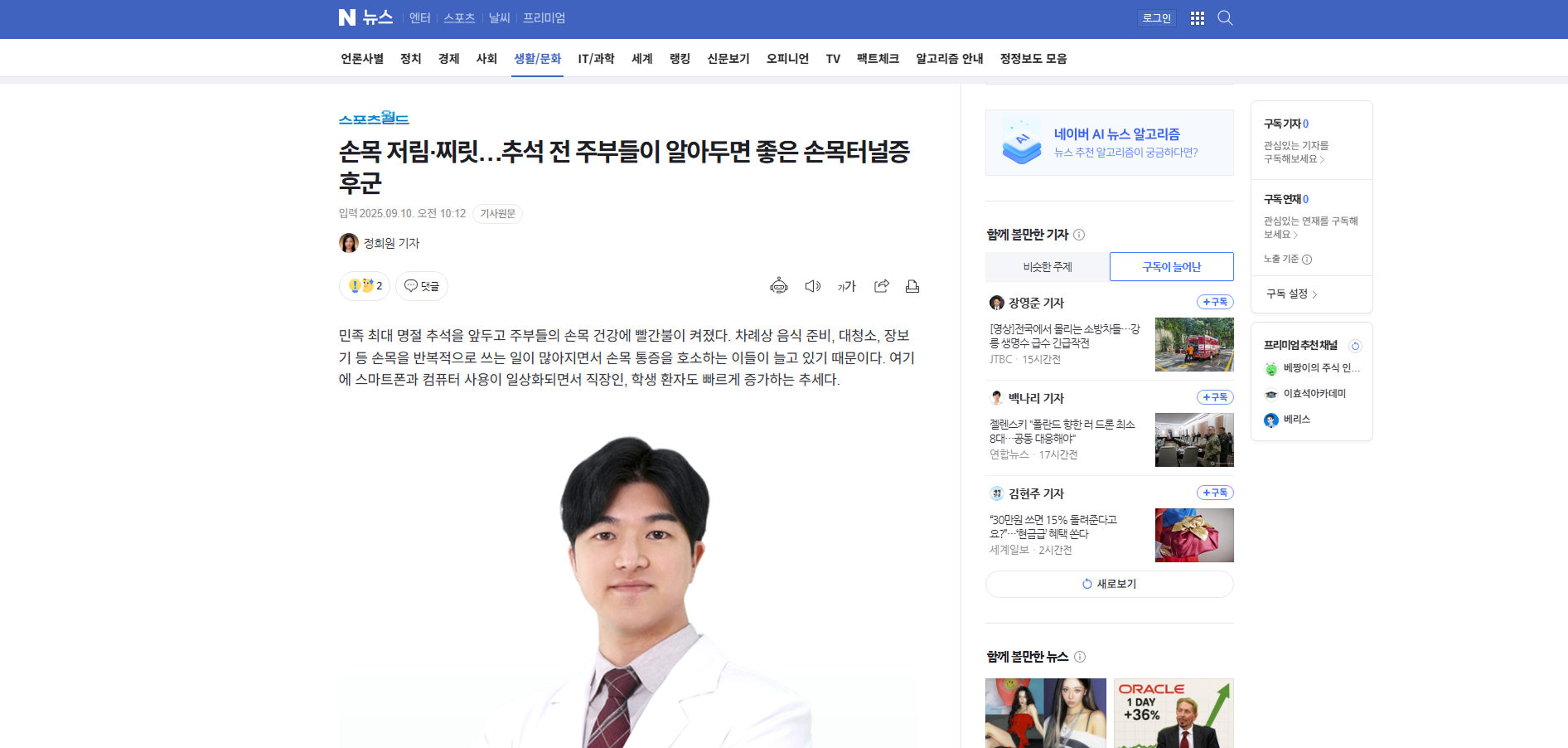 손목 저림·찌릿…추석 전 주부들이 알아두면 좋은 손목터널증후군