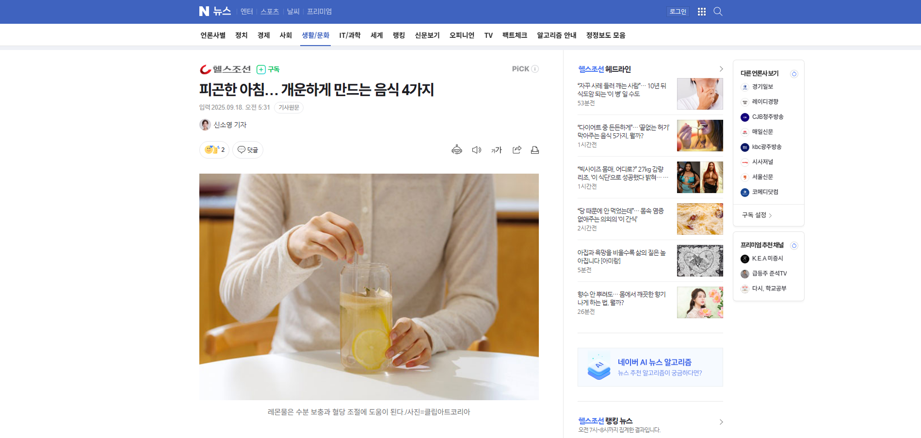 레몬물은 수분 보충과 혈당 조절에 도움이 된다./사진=클립아트코리아아침에 일어나도 머리가 맑지 않고 몸이 무겁게 느껴진다면, 단순 피곤함이 아니라 몸속 에너지 대사, 수분 균형, 혈당 유지에 문제가 있을 수 있다. 이럴 땐 카페인으로 잠깐 각성하는 것보다 피로의 근본 원인을 풀어주는 음식이 도움이 된다. 아침을 개운하게 시작할 수 있는 음식들을 소개한다.