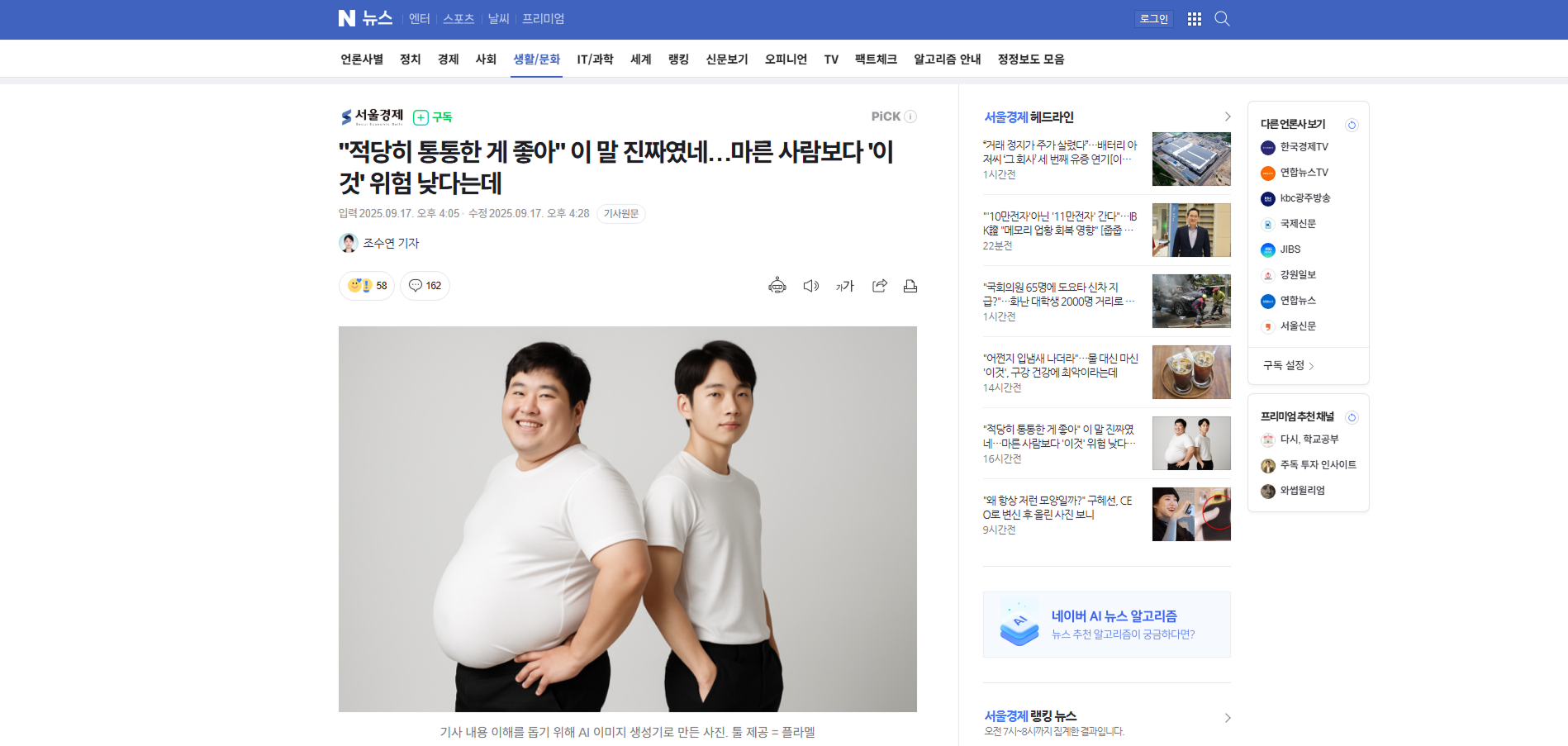 "적당히 통통한 게 좋아" 이 말 진짜였네…마른 사람보다 '이것' 위험 낮다는데