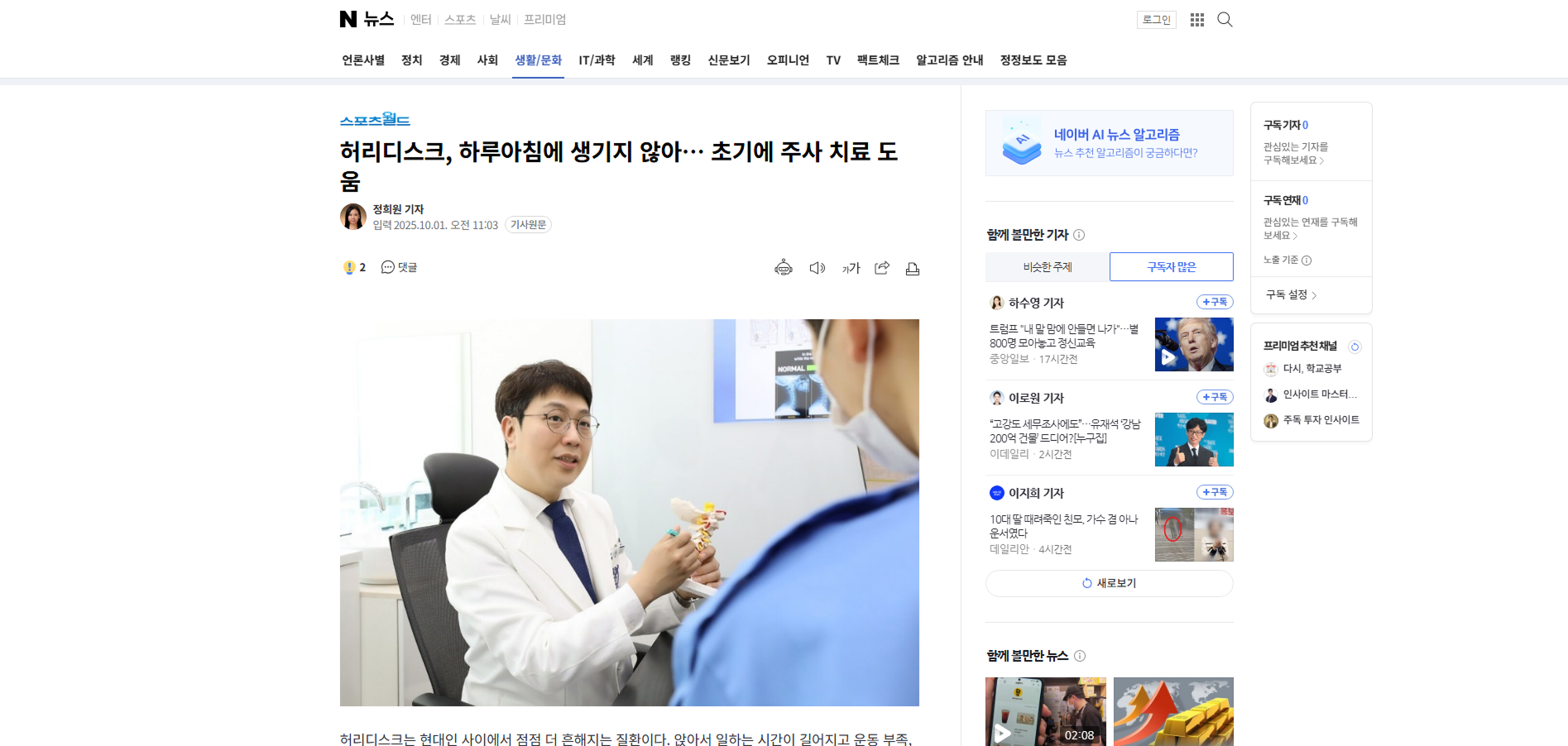 한편, 허리디스크 예방과 관리를 위해서는 올바른 생활습관이 필수다. 구부정한 자세나 장시간 앉아 있는 습관은 허리에 부담을 준다. 무거운 물건을 들 때는 허리보다 무릎을 굽혀 다리 힘을 쓰는 것이 허리 건강에 좋다. 꾸준한 허리 근육 강화 운동 역시 중요하다. 신전 운동이나 복근 운동을 통해 허리 주변 근육을 튼튼하게 하면 디스크에 가해지는 부담을 줄일 수 있다. 다만 급성 통증이 있을 때는 무리한 운동을 피하고, 증상이 가라앉은 후 서서히 운동을 시작하는 것이 바람직하다.